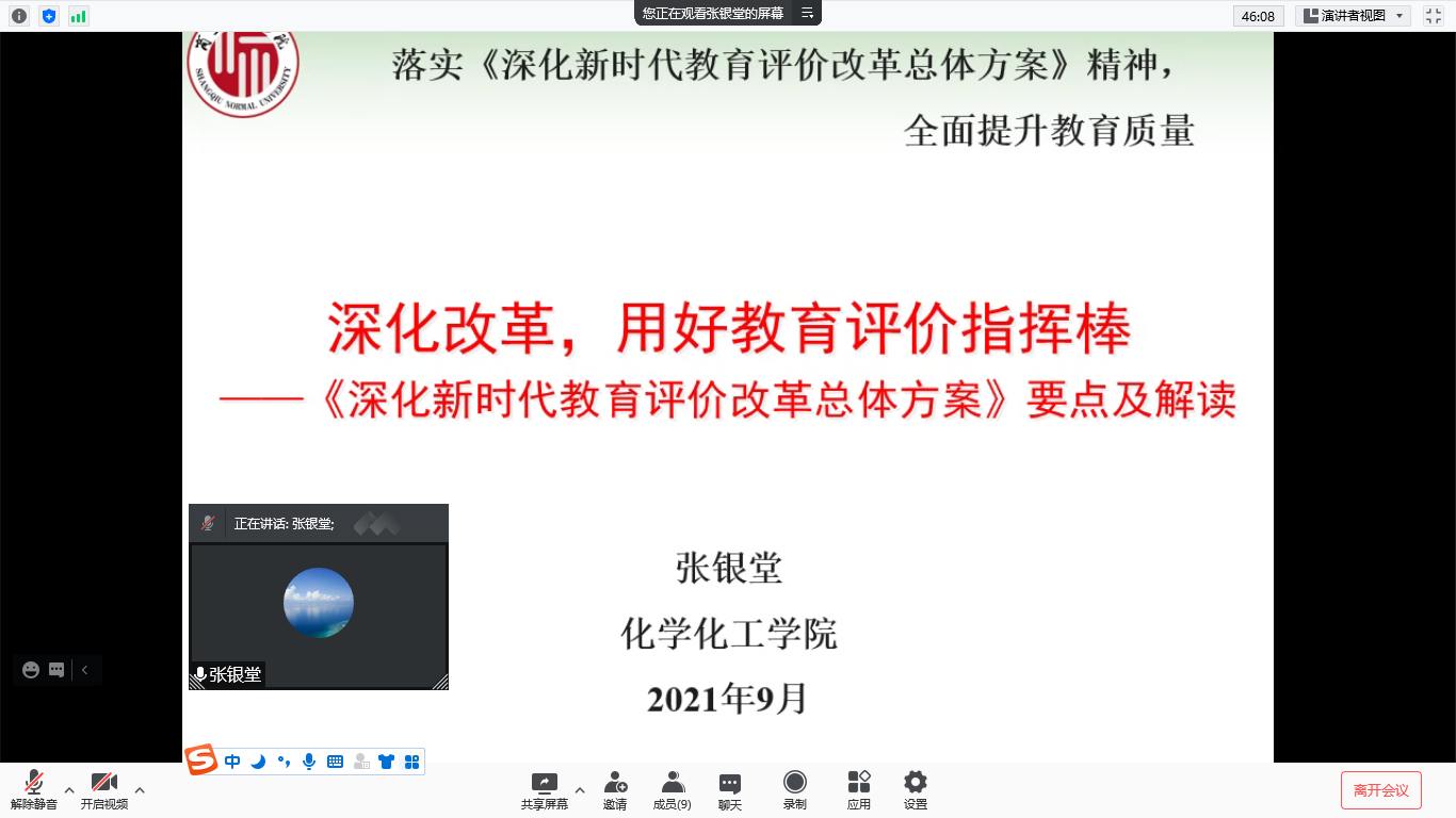 会上,院党委书记李海涛结合秋季开学中层干部会议司林胜、陈向炜讲话精神和学院工作实际,带领大家深入学习习近平总书记“七一”重要讲话和新修订的《教育法》;院长张银堂结合学校《“十四五”时期深化教育综合改革实施方案》和《关于推进落实<深化新时代教育评价改革总体方案>工作的通知》,带领大家深入学习领会习近平总书记关于教育重要论述,深刻理解教育方针的丰富内涵。