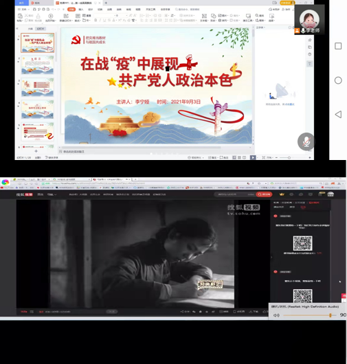 支部书记李宁娅紧紧围绕始终牢记初心和使命、坚持发扬党的优良传统和作风、不断提升工作的本领和能力三方面,鼓励青年党员要扛起责任、经受住考验,以责任担当之勇、科学防控之智进一步打好疫情防控阻击战。支部成员代表郝美红、王甜甜同志发表对共产党员在疫情期间作出巨大贡献的感想感悟。最后全体支部成员一起观看电影散文《谁是最可爱的人》。