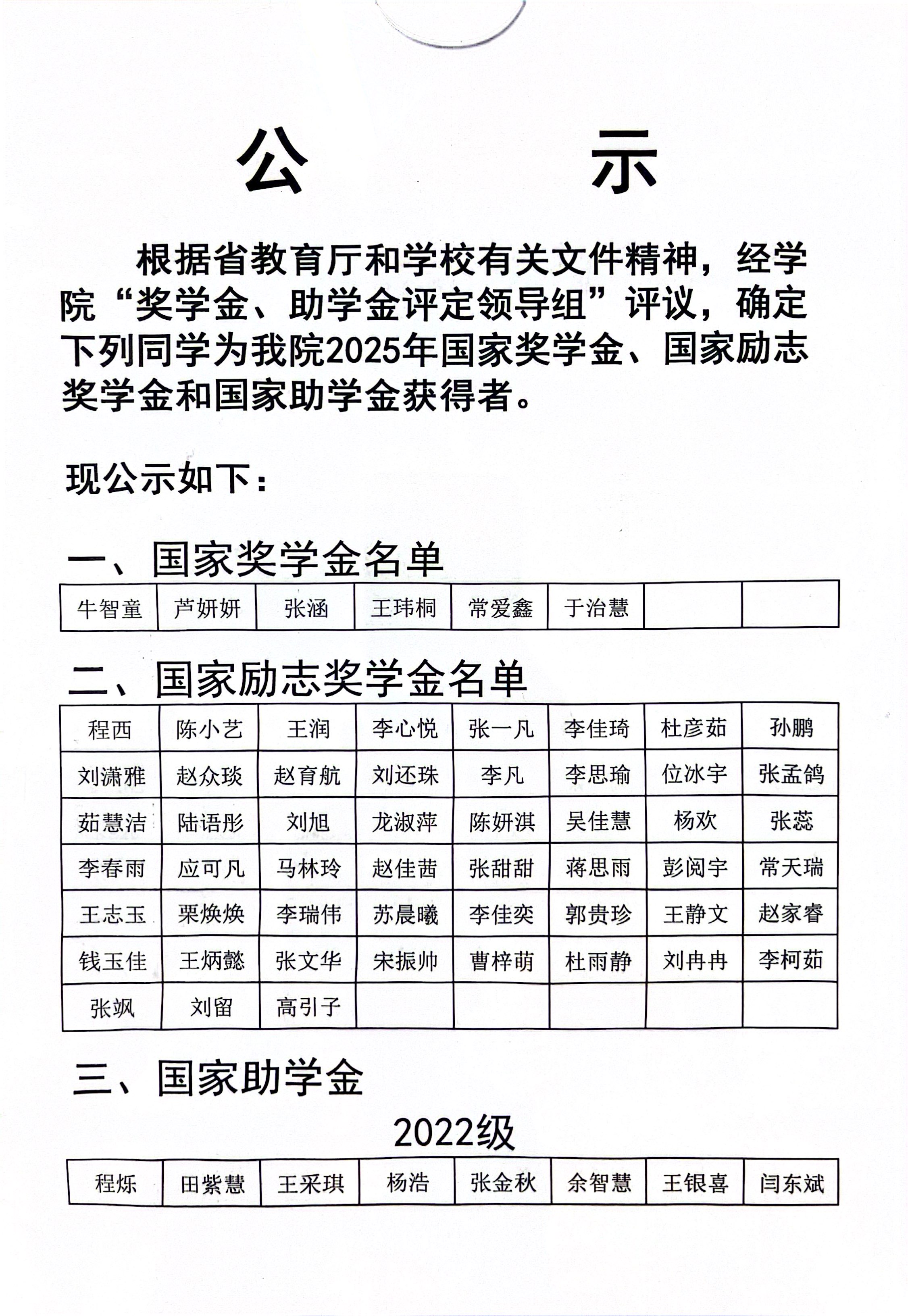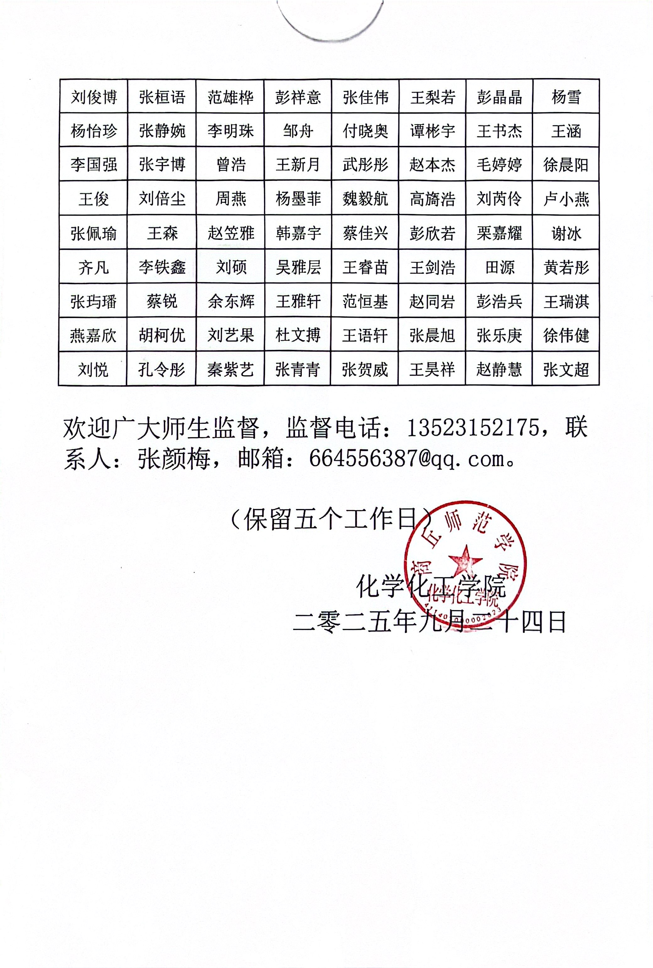 化学化工学院2025年国家奖学金、国家励志奖学金和国家助学金公示名单