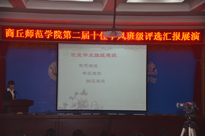 由经过复赛评选出的十个班级代表以PPT和视频的形式全面而细致的展示了他们各个班级在思想建设、学风建设、班风建设、社会实践等方面的优异表现和成果。整个活动各班都经过了精心的准备,一张张满怀记忆的幻灯片制作、流畅生动的演讲、丰富多彩的班级活动和硕果累累的荣誉赢得了评委和同学们的一致好评,化学化工学院的张帆同学慷慨激昂的演讲更是将活动推向高潮。最终经过评委的评选,永利23411集团张帆所代表的2013级化学专业2班脱颖而出获得本次十佳学风班级评选汇报展演第一名。