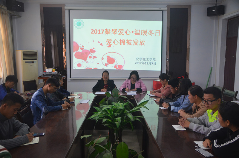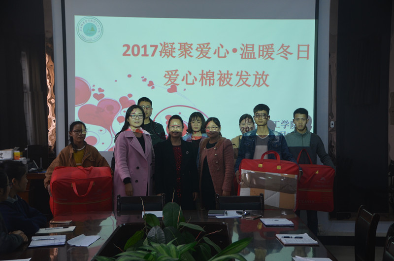 为进一步弘扬扶贫济困、助人为乐、无私奉献的良好风气,让贫困生温暖过冬,11月7日中午,化学化工学院于我校文化路校区7号楼院会议室举行了“2017年凝聚爱心·温暖冬日爱心棉被发放”仪式,院党总支副书记刘瑛、团总支书记李龙梅、17级辅导员郭家瑞老师出席仪式,6位受助学生以及17级各班负责人及学生代表参加了活动,仪式由李龙梅老师主持。