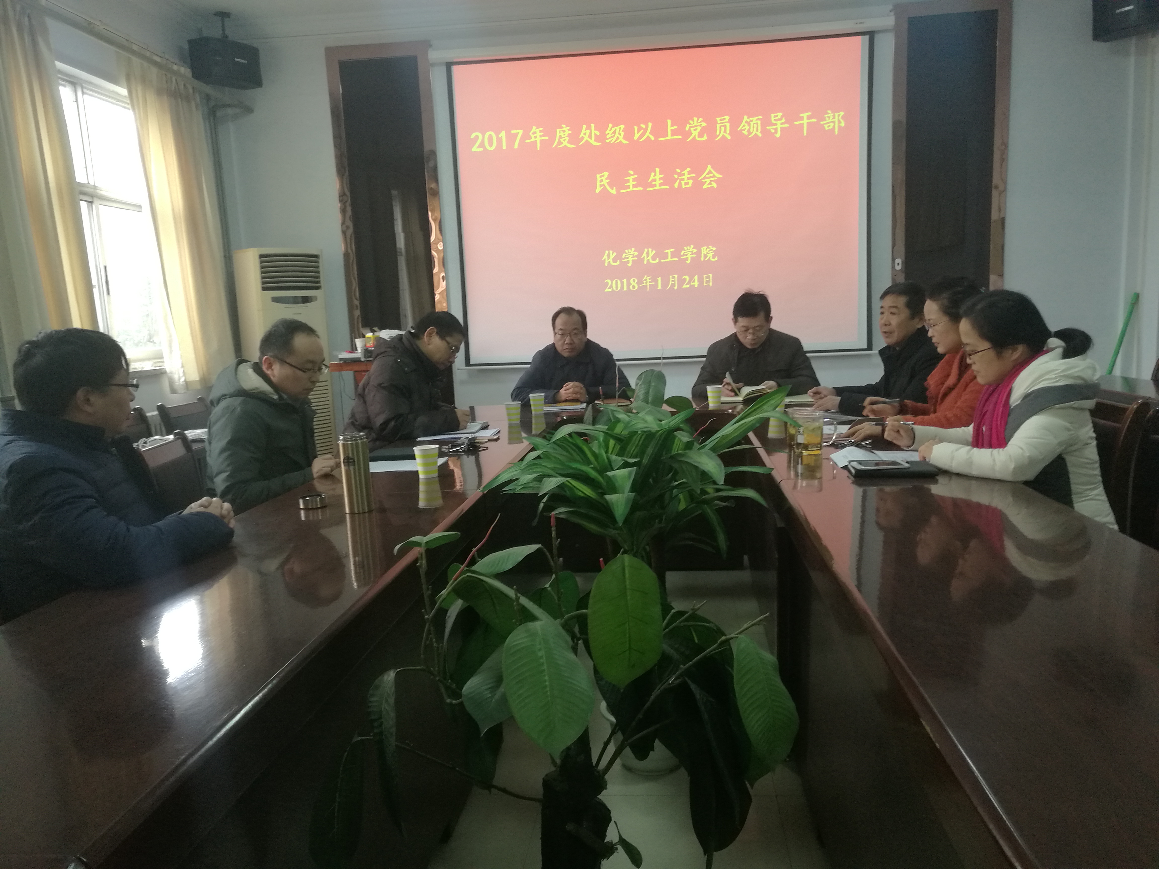 1月23日下午,化学化工学院2017年度处级领导班子民主生活会在文化路校区7号楼院会议室召开。学校第九督导组组长副校长郭文佳、成员招生与就业处处长庞永祥一行莅临会议,学院党总支书记韩忠民、院长瞿鹏、党总支副书记刘瑛、副院长孟团结、周艳丽参加了会议,省工程实验室主任刘澜涛列席会议。会议由韩忠民书记主持。