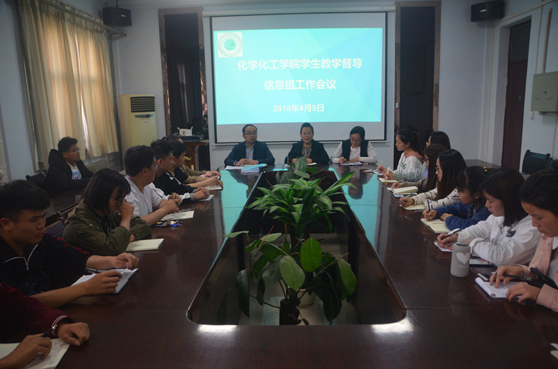 4月9日下午,化学化工学院在学院会议室召开2017-2018第二学期学生教学督导信息员工作会议,化学化工学院党总支副书记刘瑛、副院长孟团结、团总支书记李龙梅及全体信息员参加了会议,会议由刘瑛副书记主持。
