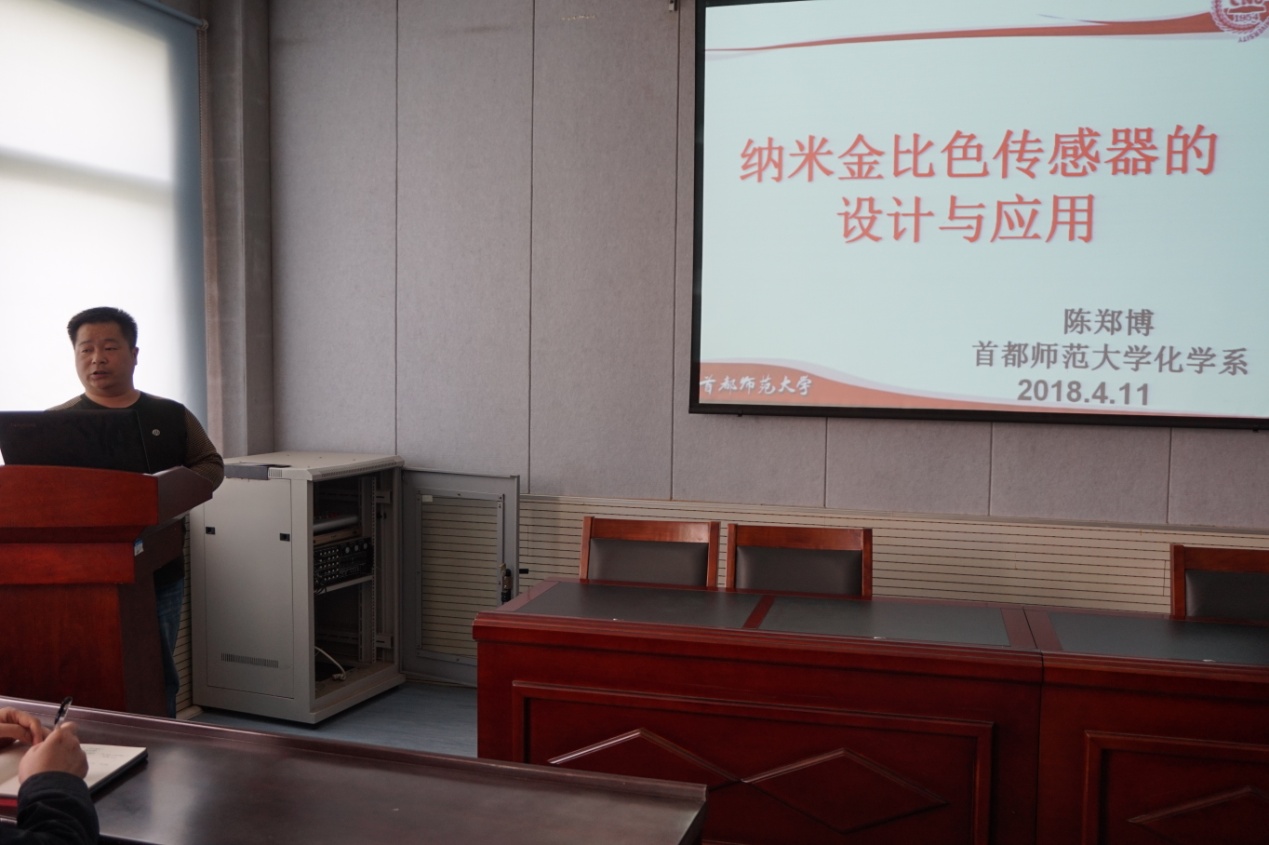 2018年4月11日上午,首都师范大学陈郑博博士应邀在化学实验楼学术报告厅做了题为“纳米金比色传感器的设计与应用”的学术报告。报告会由化学化工学院瞿鹏院长主持,40多名老师、研究生及高年级本科生聆听了此次报告。