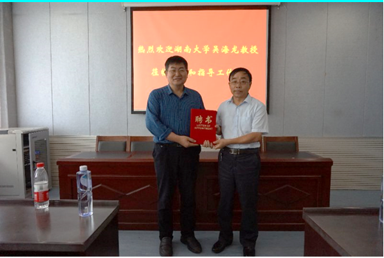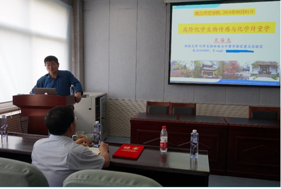 受化学化工学院和河南省生物分子识别与传感重点实验室的邀请,8月1日上午,湖南大学吴海龙教授莅临我校进行学术交流。在睢阳校区化学实验楼311会议室,徐茂田副校长与吴教授进行了会谈。徐校长代表学校对吴教授的到来表示由衷的欢迎和感谢,并向吴教授介绍了实验室近期在生物传感领域做出的一系列成果。吴教授对实验室的快速发展高度认可。徐校长为吴教授颁发了客座教授证书。聘任仪式结束后,吴教授做了“高阶化学生物传感与化学计量学”的学术报告,报告会由张银堂主任主持,化学化工学院院长瞿鹏教授、副院长周艳丽教授以及部分教师和学生参加了学术报告会。