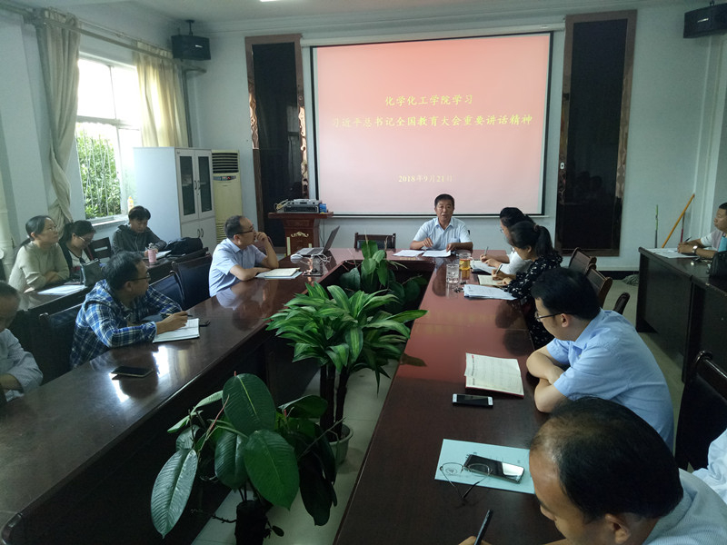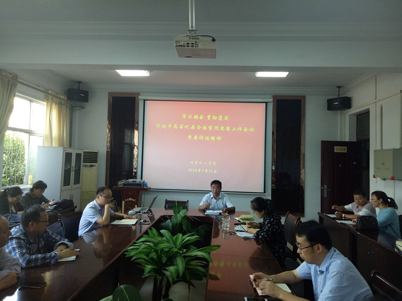 9月21日下午,化学化工学院全体教工于文化路校区7号楼院会议室深入学习领会贯彻落实习近平总书记在全国宣传思想工作会议重要讲话和习近平总书记在全国教育大会上重要讲话精神,由学院党总支书记韩忠民领学。
