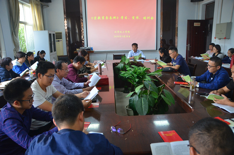9月28日下午,化学化工学院于文化路校区7号楼会议室召开《宗教事务条例》学习、宣传、培训会。党总支副书记刘瑛、副院长孟团结及全体教职工参加,会议由学院党总支书记韩忠民主持。