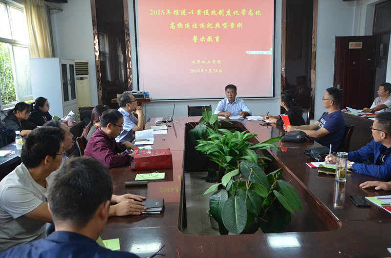 为加强学生健康成长,增强学生法制观念,积极引导学生树立正确的人生价值观念。9月28日下午,化学化工学院于七号楼会议室举行“2018年推进以案侵改制度化常态化高校违法违纪警示教育”会议。党总支副书记刘瑛、副院长孟团结及全体教职工参加会议,会议由学院党总支书记韩忠民主持。