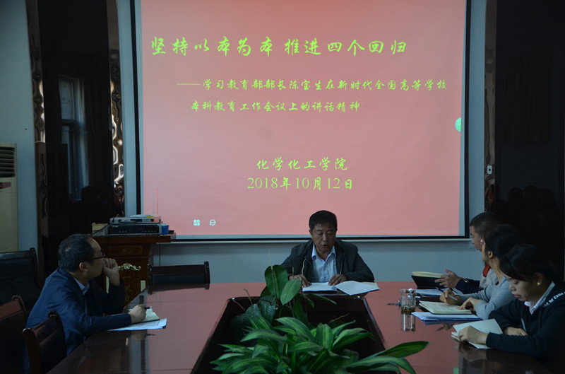 10月12日下午,化学化工学院于文化路校区7号楼会议室召开学习“教育部部长陈宝生在新时代全国高等学校本科教育工作会议上的讲话精神”会议。会议由学院党总支书记韩忠民主持,副院长孟团结、周艳丽出席,全体教职工参加。