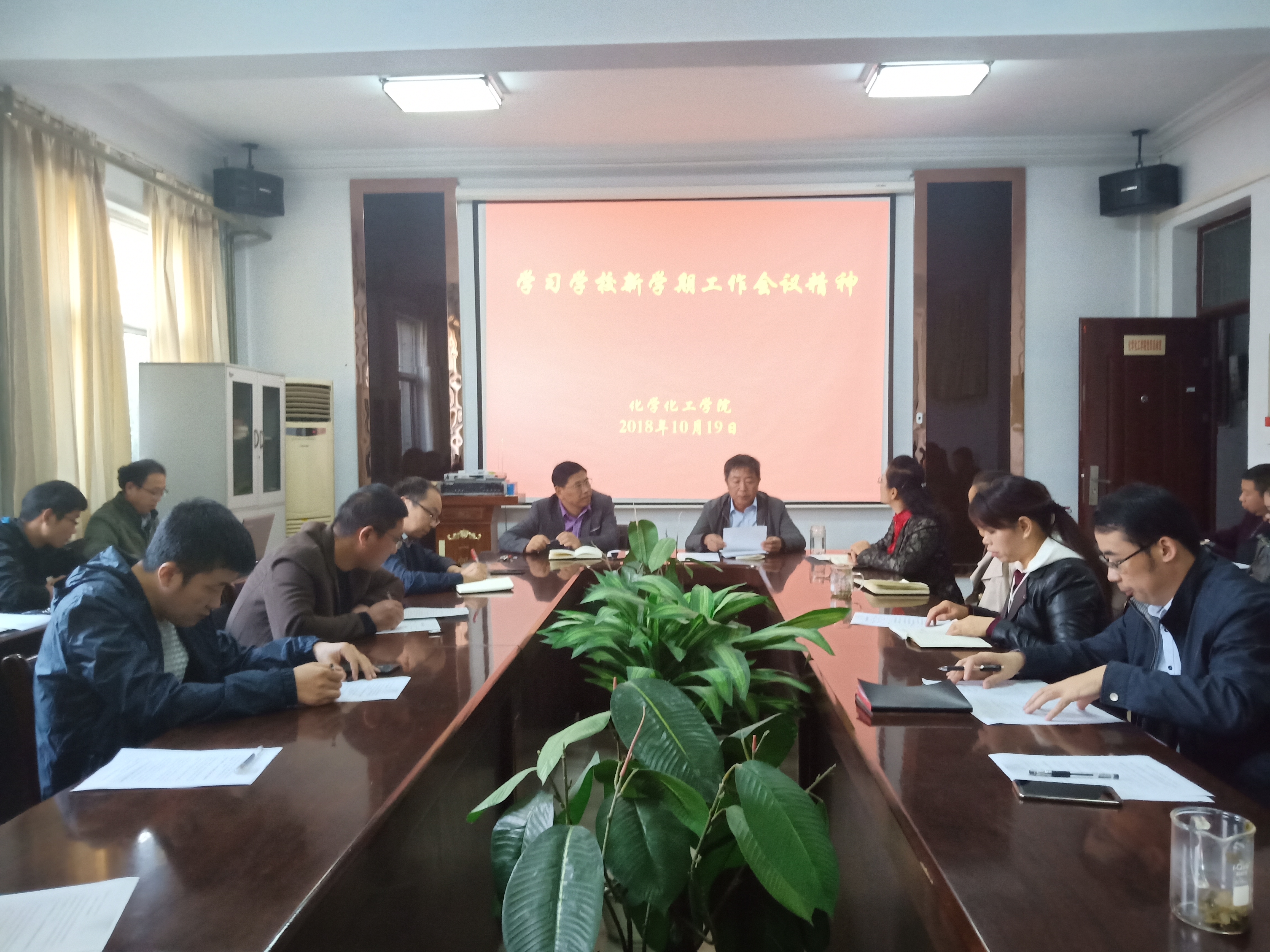 10月19日下午,化学化工学院于睢阳校区7号楼会议室学习学校新学期工作会议精神,院长瞿鹏、党总支副书记刘瑛、副院长孟团结、周艳丽出席,全体教职工参加会议。会议由院党总支书记韩忠民主持。