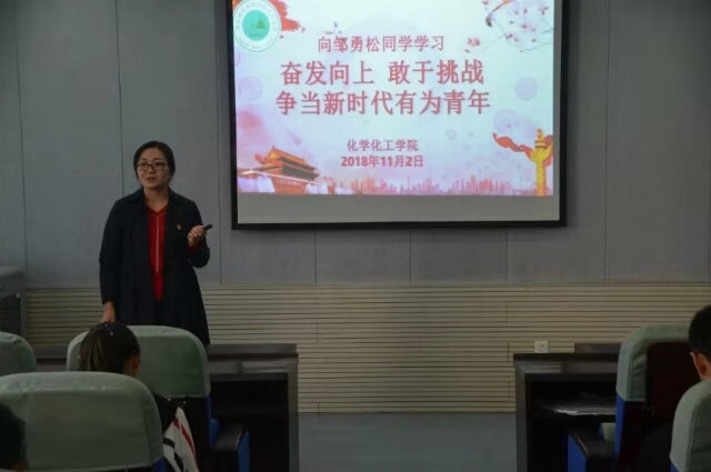 动员会结束后,学院团总支、学生会于化学实验楼报告厅组织开展学习会议,由团总支书记李龙梅带领团支部团员青年一起学习邹勇松同学的先进事迹。