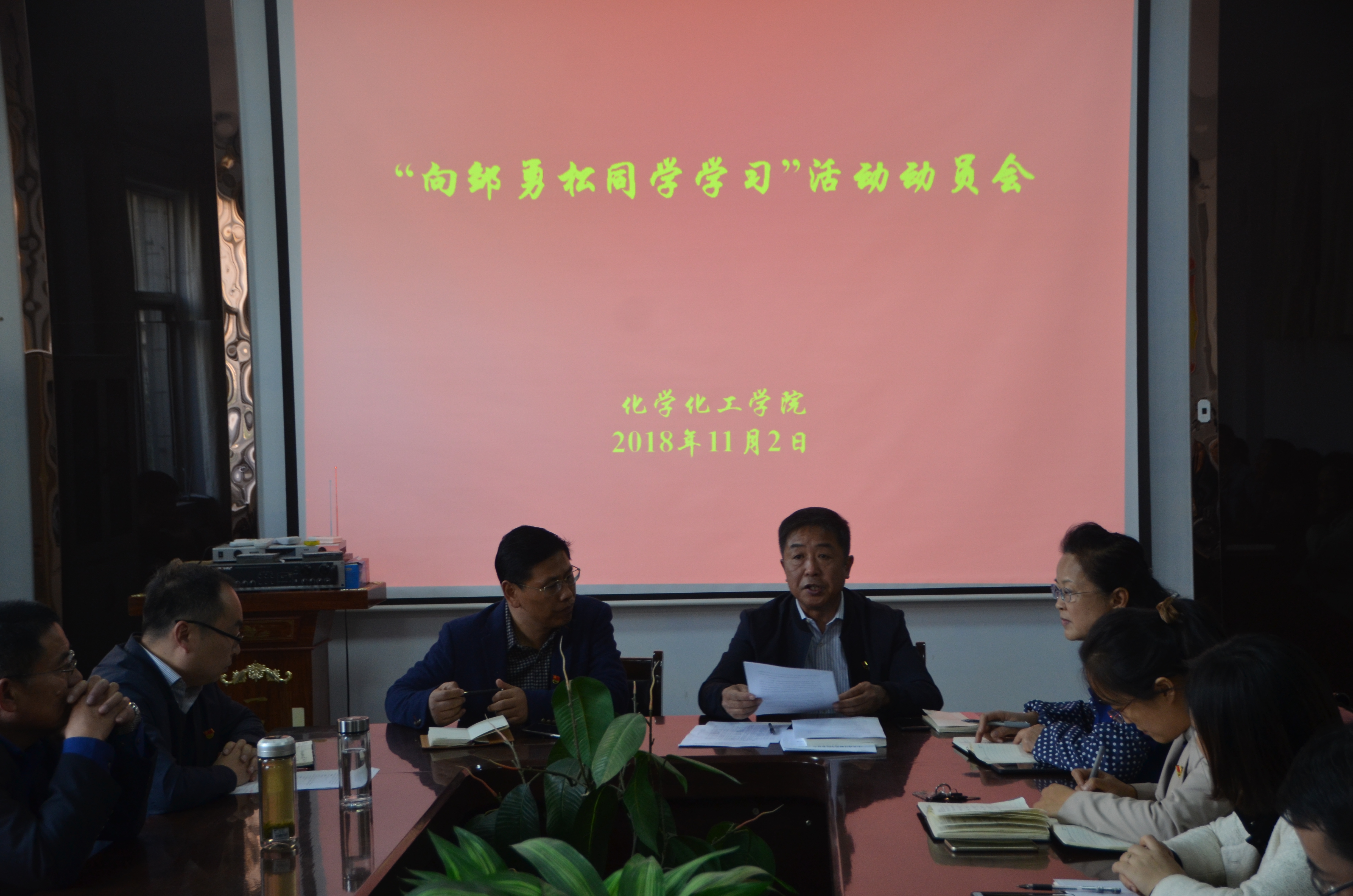 为进一步弘扬社会主旋律,充分发挥先进典型的示范带动作用,集聚和传播正能量。11月2日下午,化学化工学院于睢阳校区7号楼会议室开展“向邹勇松同学学习”活动动员会。全体教职工参加了会议,会议由院党总支书记韩忠民主持。