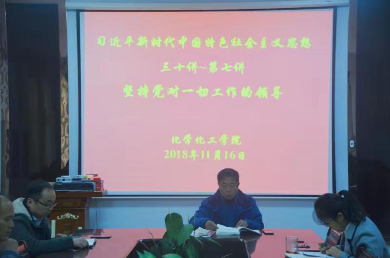 11月16日下午,化学化工学院于睢阳校区7号楼会议室召开全体教职工大会,学习“习近平新时代中国特色社会主义思想三十讲之第七讲坚持党对一切工作的领导”。全体教职工参加会议,会议由院党总支书记韩忠民主持。