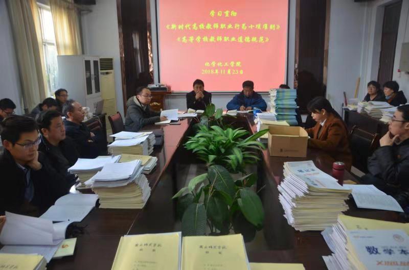 11月23日下午,化学化工学院于睢阳校区7号楼会议室召开教职工会议,集中学习贯彻《新时代高校教师职业行为十项准则》及《高等学校教师职业道德规范》。全体教职工参加会议,党总支书记韩忠民主持会议。