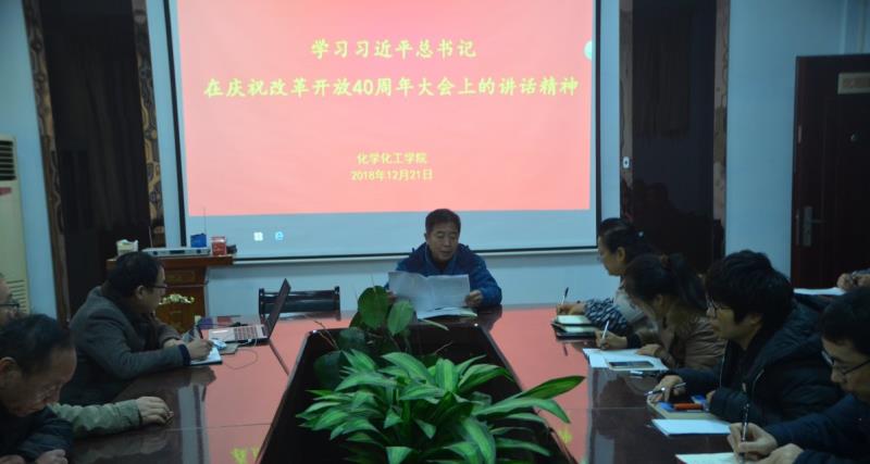 12月21日下午,化学化工学院于睢阳校区7号楼会议室召开全体教职工大会,学习“习近平总书记在庆祝改革开放40周年大会上的讲话精神”。全体教职工参加会议,会议由党总支书记韩忠民主持。