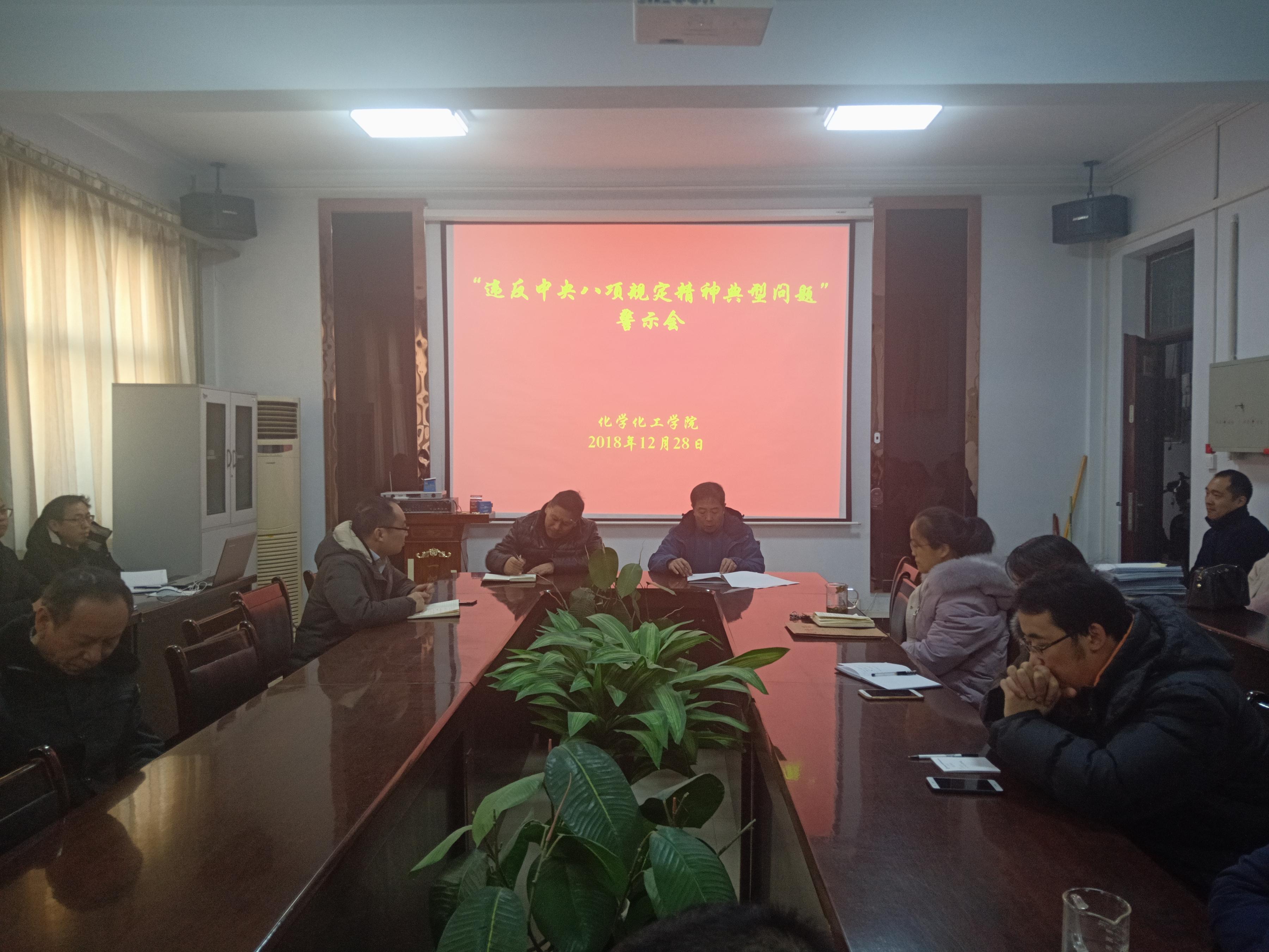 2019年元旦、春节将至,为做好“双节”工作,12月28日下午,化学化工学院于睢阳校区7号楼院会议室召开 “违反中央八项规定精神典型问题警示会”, 全体教职工参加,党总支书记韩忠民主持。
