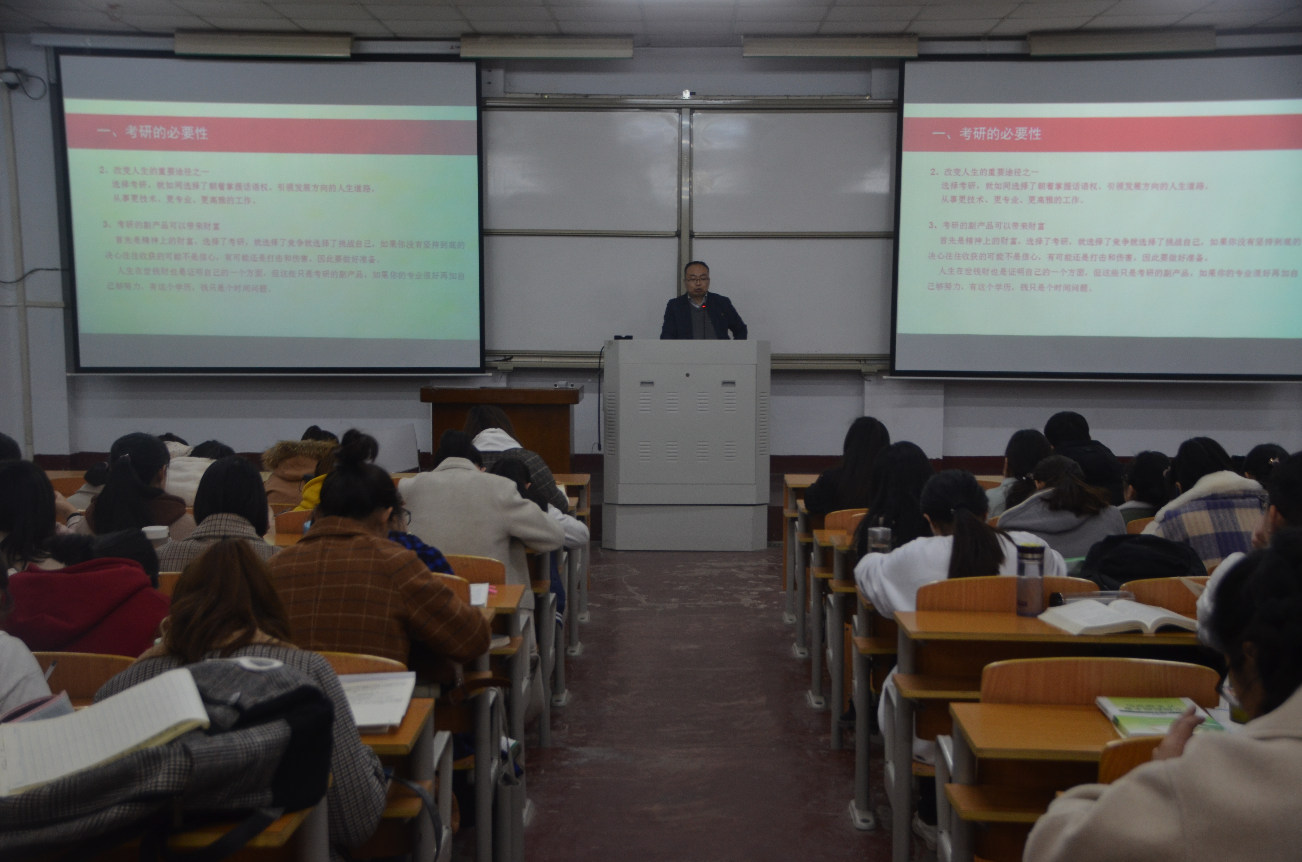 动员会上,孟团结做了精彩细致的动员讲座,从考研的必要性展开,为同学们分析了考研的形势与意义,鼓励同学们选择考研为将来更好的就业打下基础。接着,从考研政策、合理定位、考研的时间和考研应掌握的信息进行了详细的讲解。他还强调考研是个艰苦的过程,要保持三心:准备吃苦的决心、克服困难的信心、抵制各种诱惑及耐得住寂寞的恒心。同时,向同学们传授了有关考研初试和复试的宝贵经验。