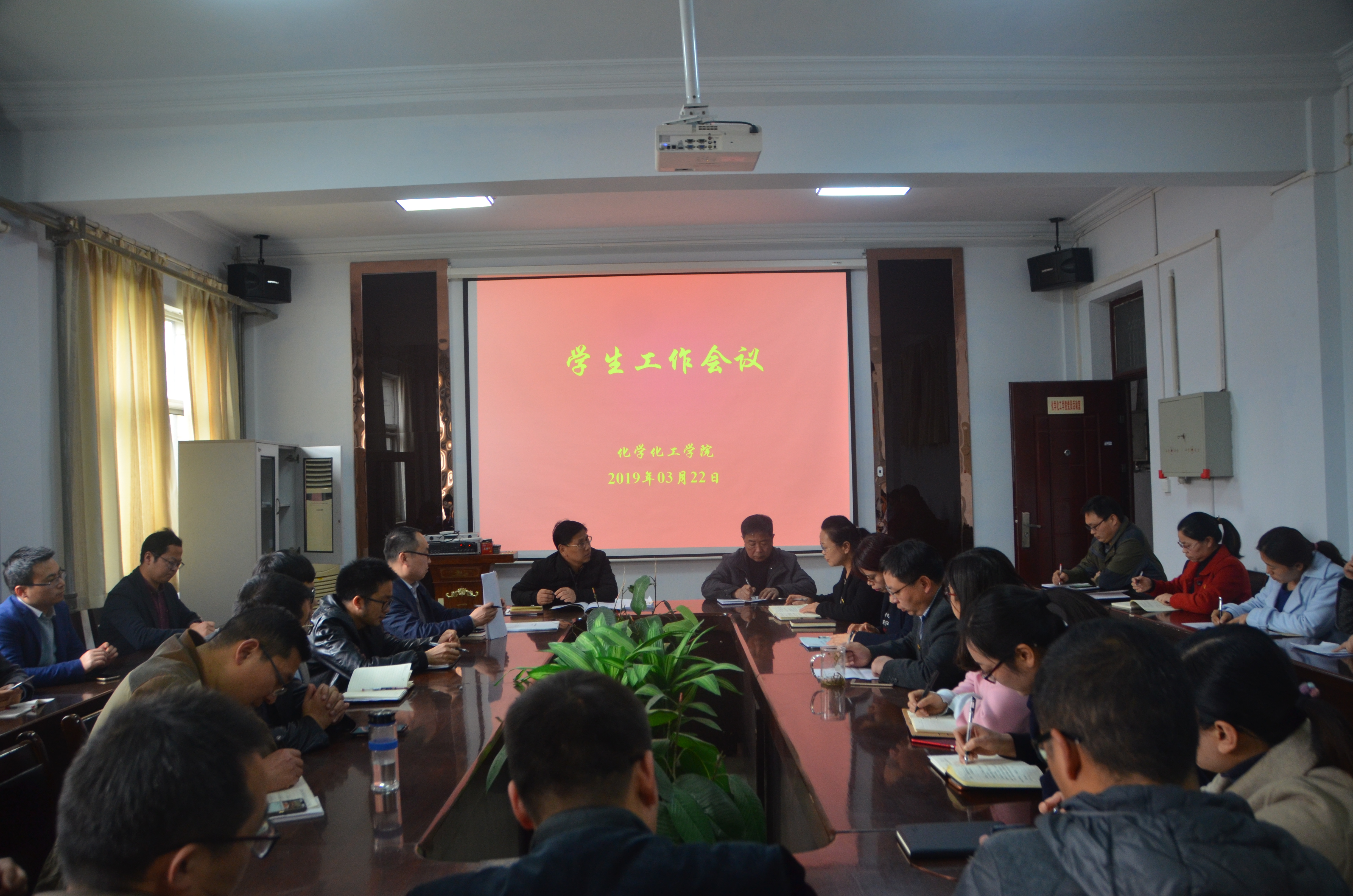 为迎接本科教学审核评估,加强学生公寓管理,规范学生文明行为。化学化工学院3月22日下午于睢阳校区7号楼会议室召开“学生工作会议”。院党政领导班子成员和全体辅导员、班主任参加了会议,会议由党总支副书记刘瑛主持。