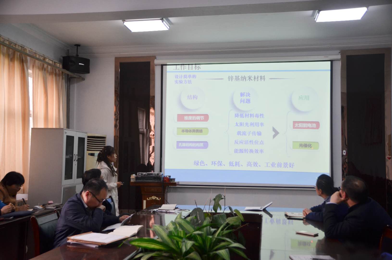 2019年3月29日下午,化学化工学院教师王立晶博士在文化路校区7号楼院会议室做了题为《锌基环境友好纳米材料的设计与合成及其能源转换与利用》的学术报告会。报告会由瞿鹏院长主持,化学化工学院全体老师参加了报告会。