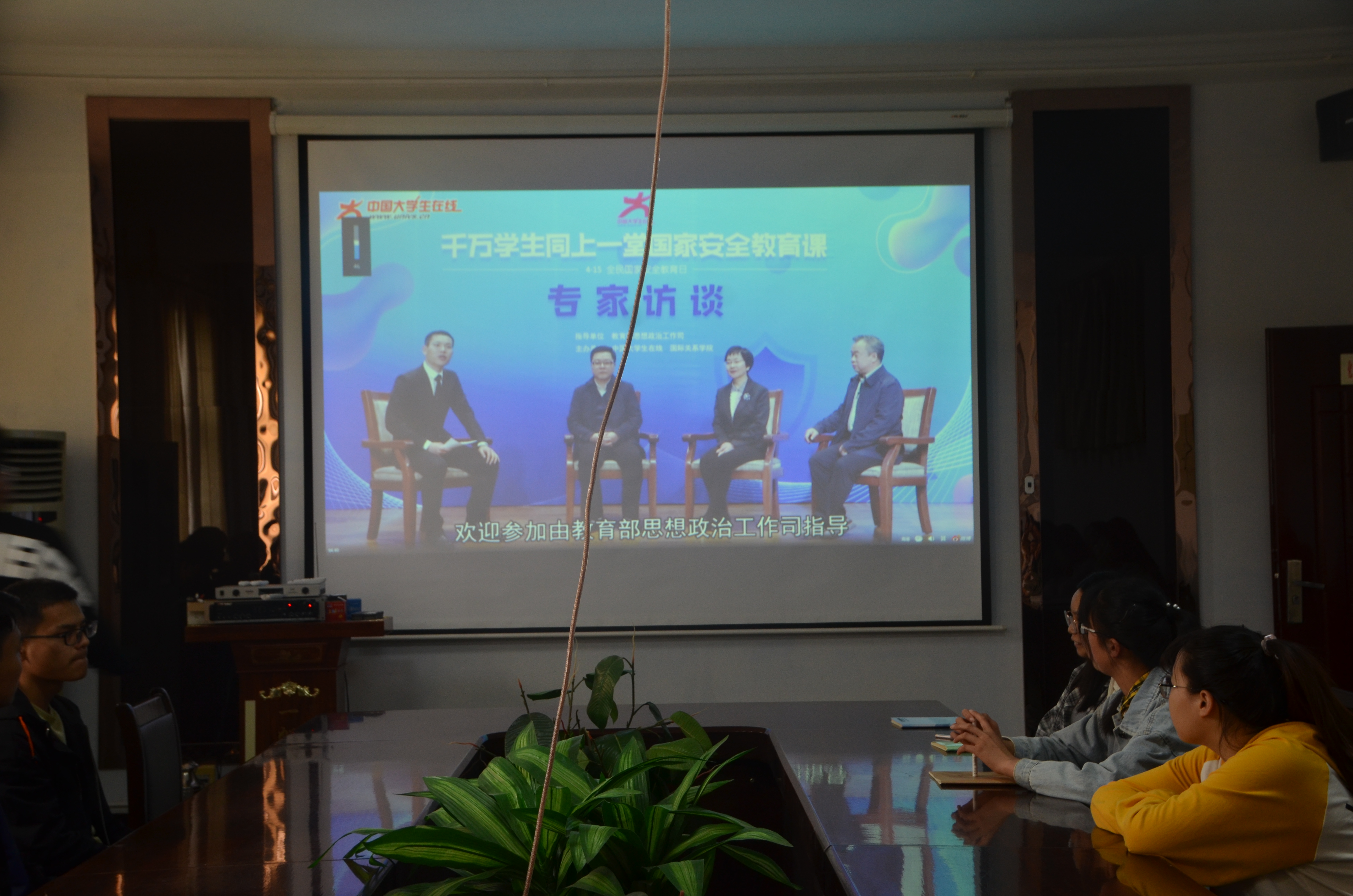 4月15日是第四个全民国家安全教育日,教育部在“中国大学生在线”网站进行了“千万学生同上一堂国家安全教育课”的访谈直播。为加强同学们的安全意识,4月15日下午,化学化工学院组织学生于睢阳校区7号楼会议室观看此次直播。