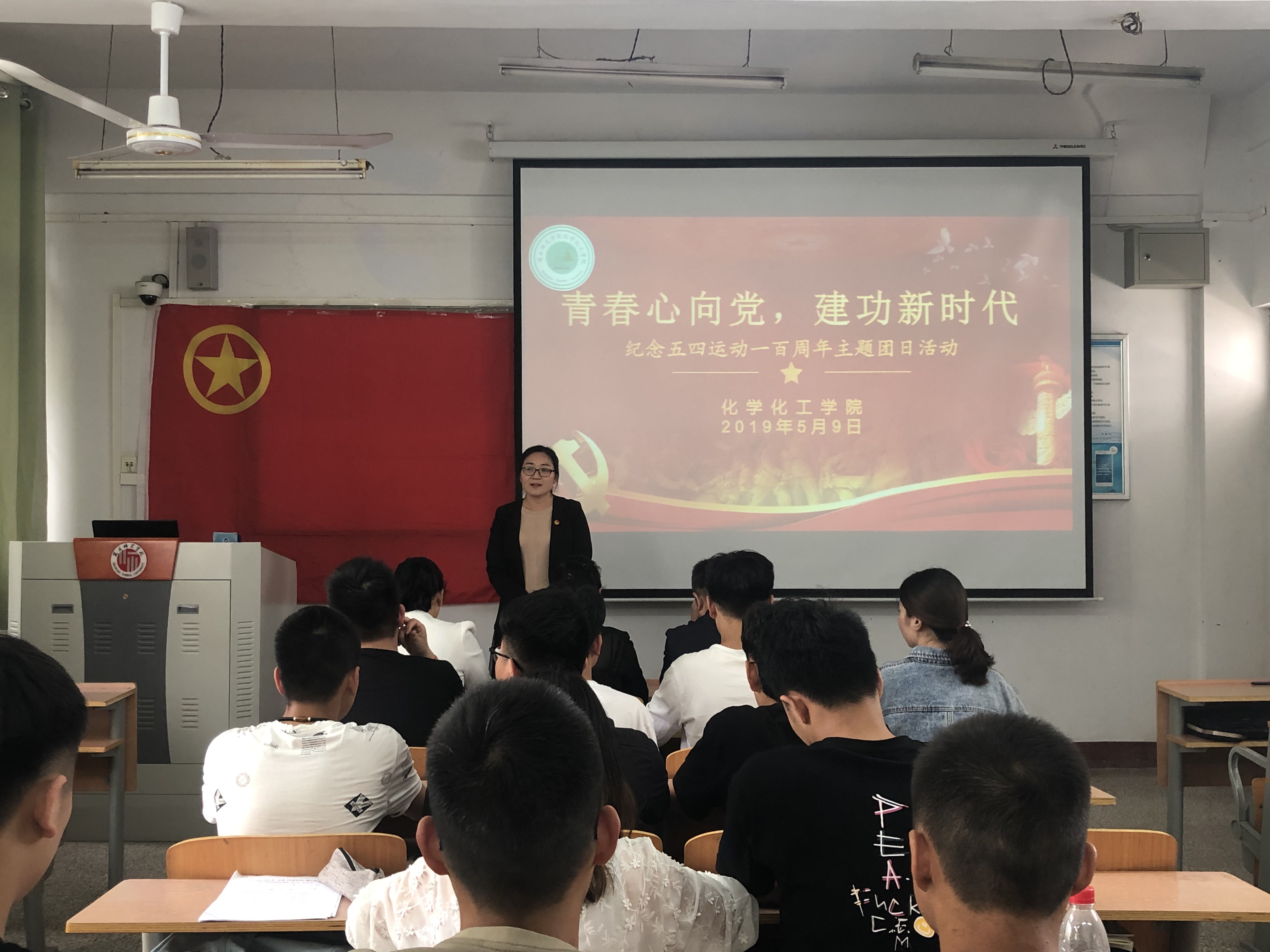 为让五四精神放射出更加夺目的时代光芒,5月9日,化学化工学院于睢阳校区1号楼409教室举行“青春心向党 建功新时代”纪念五四运动100周年主题团日活动。校团委副书记蒯秀丽、院党总支书记韩忠民、院党总支副书记刘瑛、团总支书记李龙梅出席此活动,团总支·学生会主席团以及17、18级各班班长、团支书、宣传委员、组织委员参加此活动。会议由组织部副部长李远洋主持。