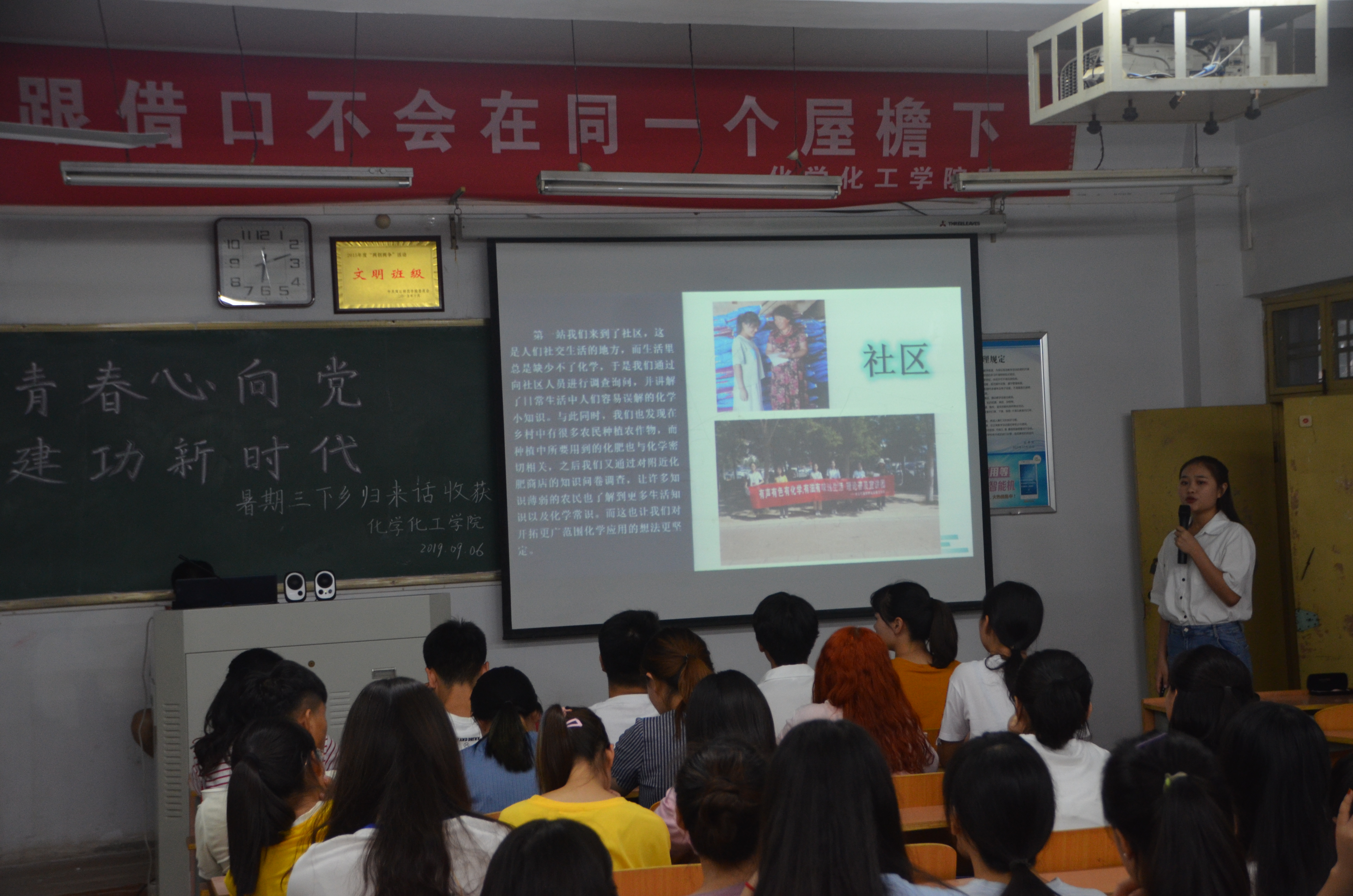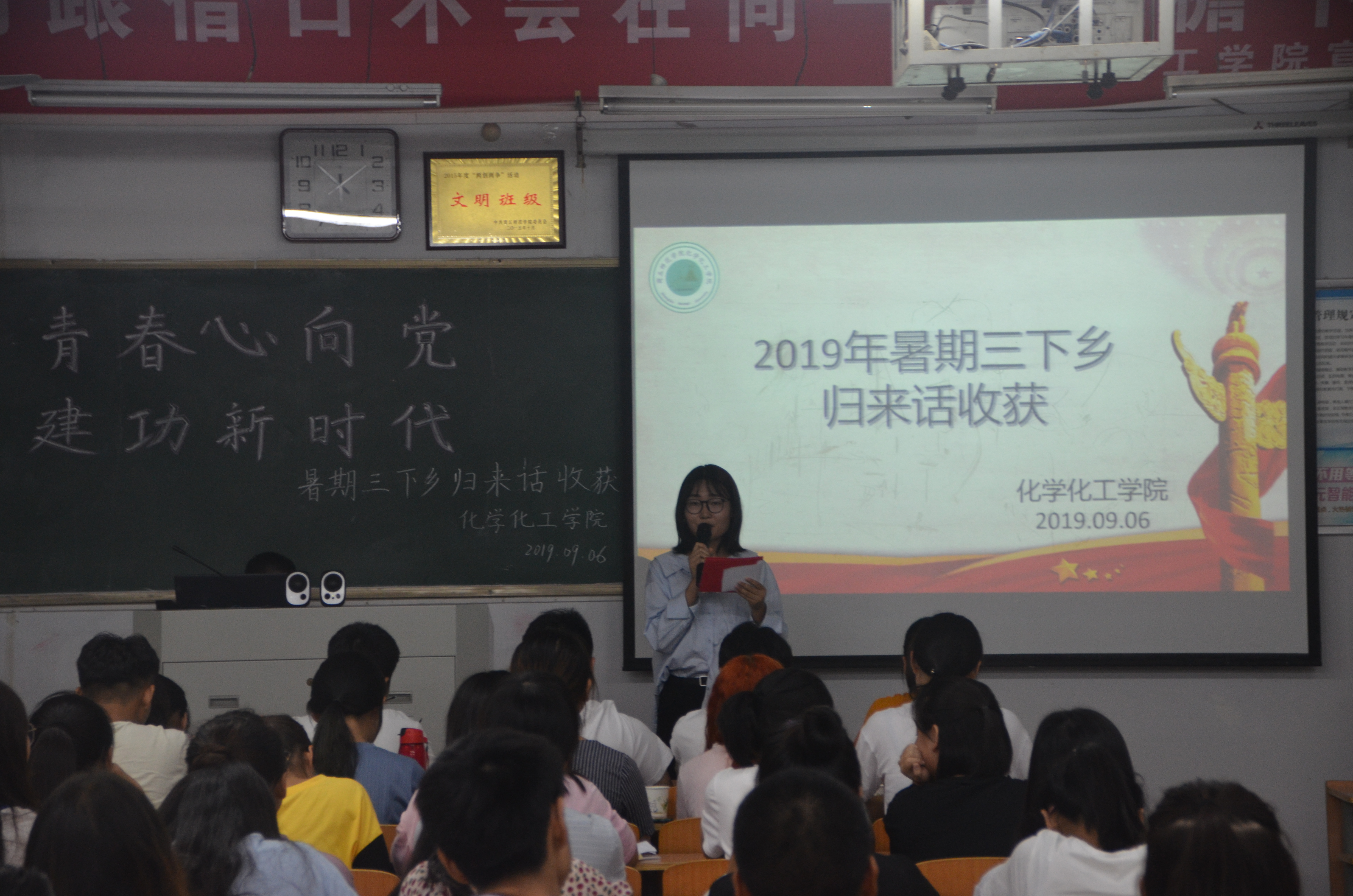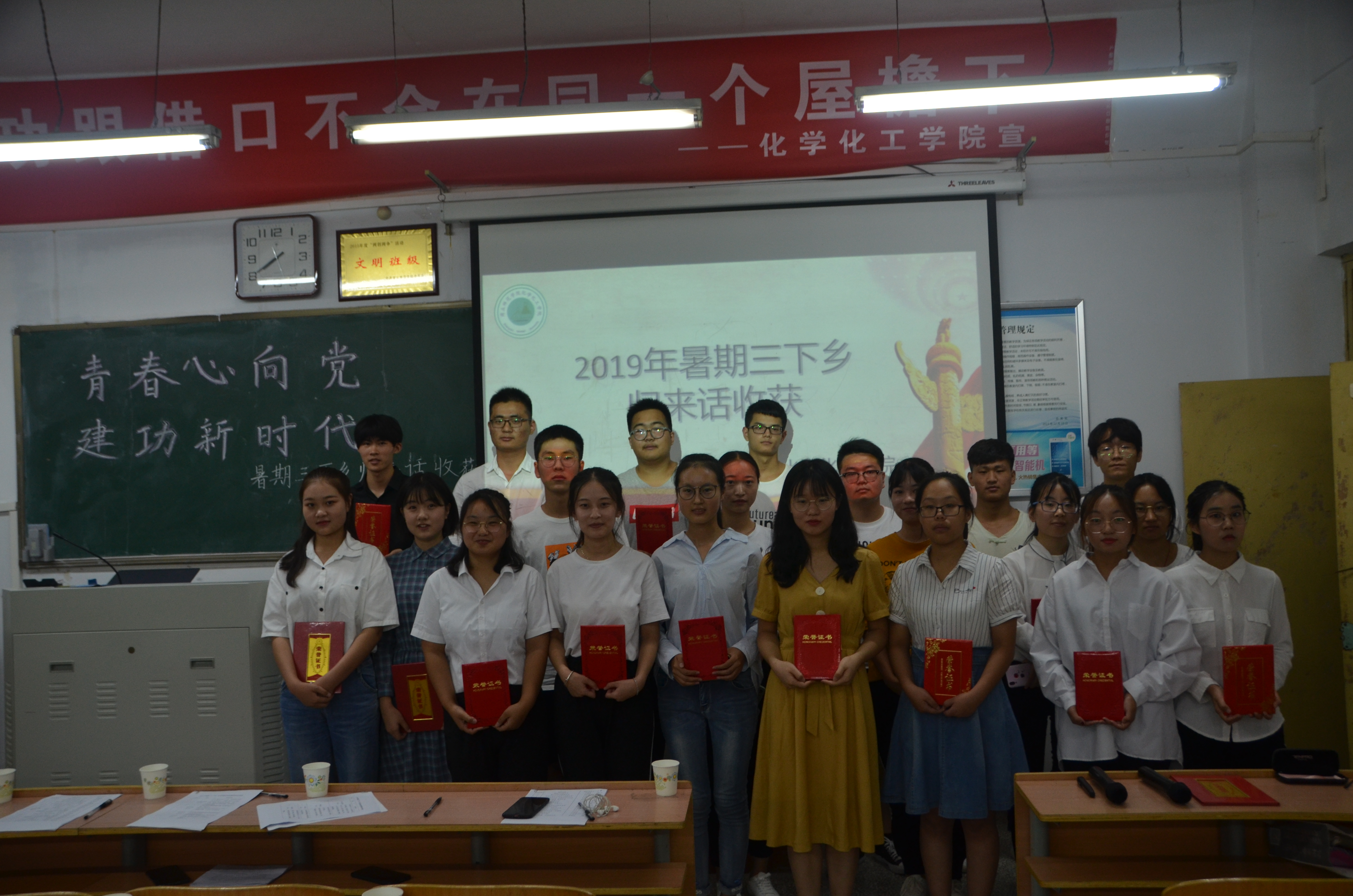 为深入学习贯彻习近平新时代中国特色社会主义思想,贯彻党的十九大和十九届二中、三中全会以及习近平总书记在纪念五四运动 100 周年大会上重要讲话精神,2019 年9 月6 日,化学化工学院于睢阳校区1 号楼408 教室举办“青春心向党,建功新时代”暑假三下乡归来话收获活动。17、18 级学生代表和实践团队参加此次活动。