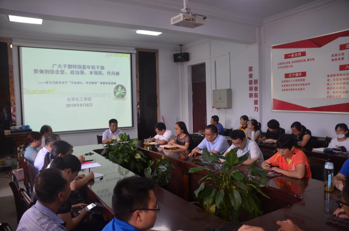 为了帮助广大干部特别是年轻干部在常学常新中加强理论修养,在真学真信中坚定理想信念,在学思践悟中牢记初心使命,在细照笃行中不断修炼自我,在知行合一中主动担当作为,保持对党的忠诚心,9月6日下午,化学化工学院于睢阳校区7号楼会议室召开了学习习近平关于“不忘初心、牢记使命”重要论述选编会议。会议由党总支书记韩忠民主持,全体教职工参加。
