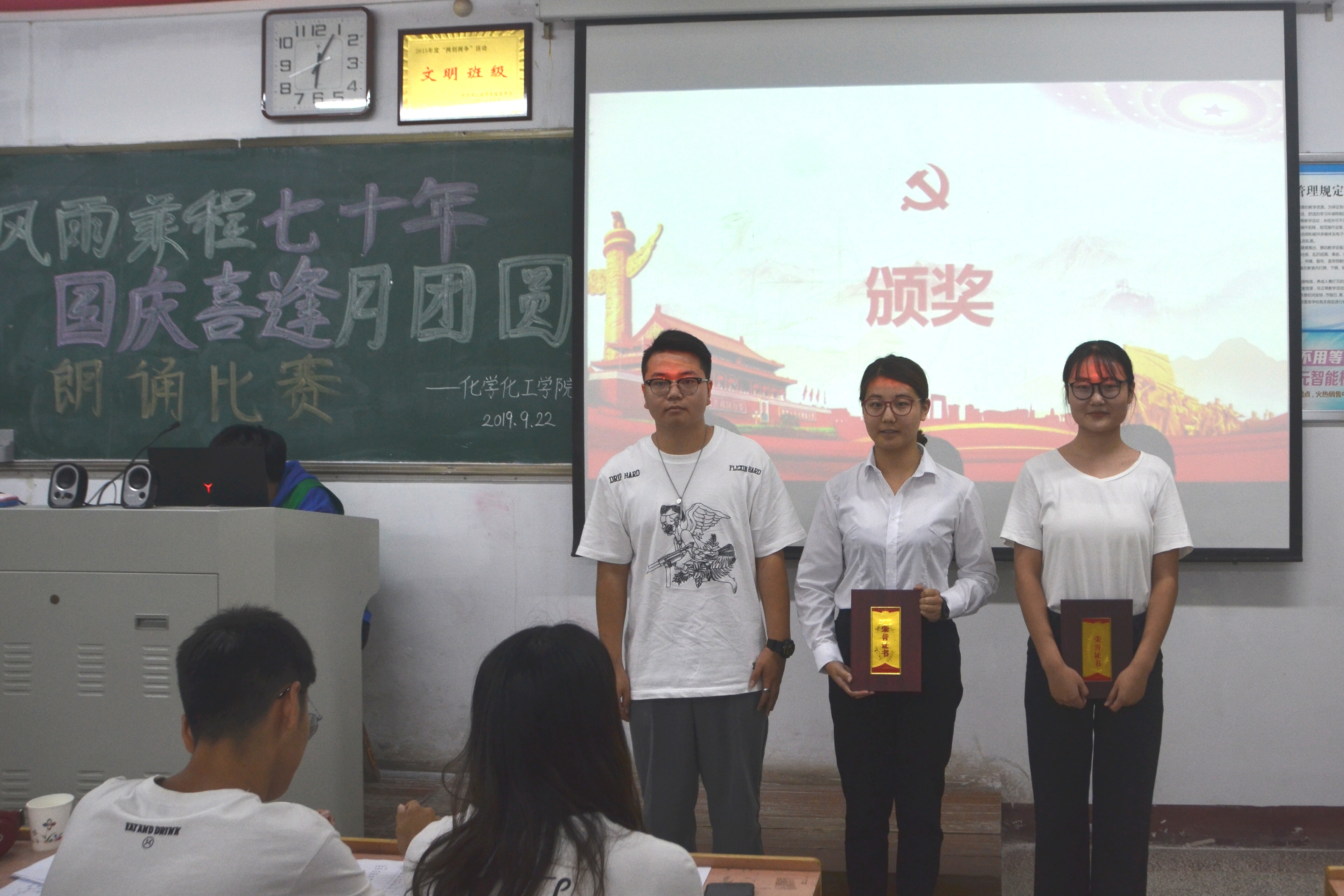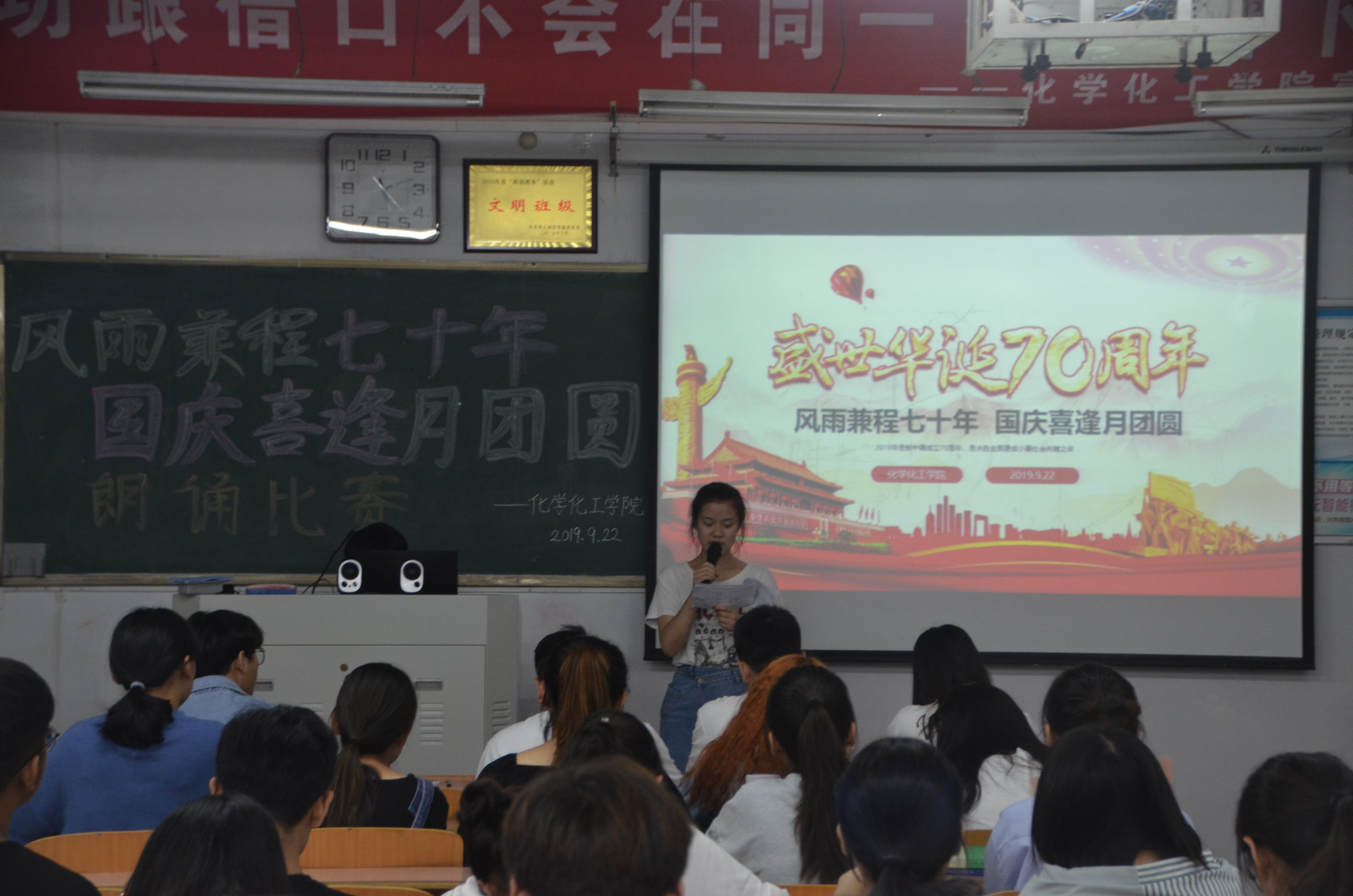 为大力弘扬爱国主义精神,讴歌中华民族实现伟大复兴中国梦的奋斗历程,追寻革命先辈的光辉足迹,2019年9月22日,化学化工学院于睢阳校区1号楼408教室举办“风雨兼程七十年 国庆喜逢月团圆”朗诵比赛,18级各班部分学生参加活动。
