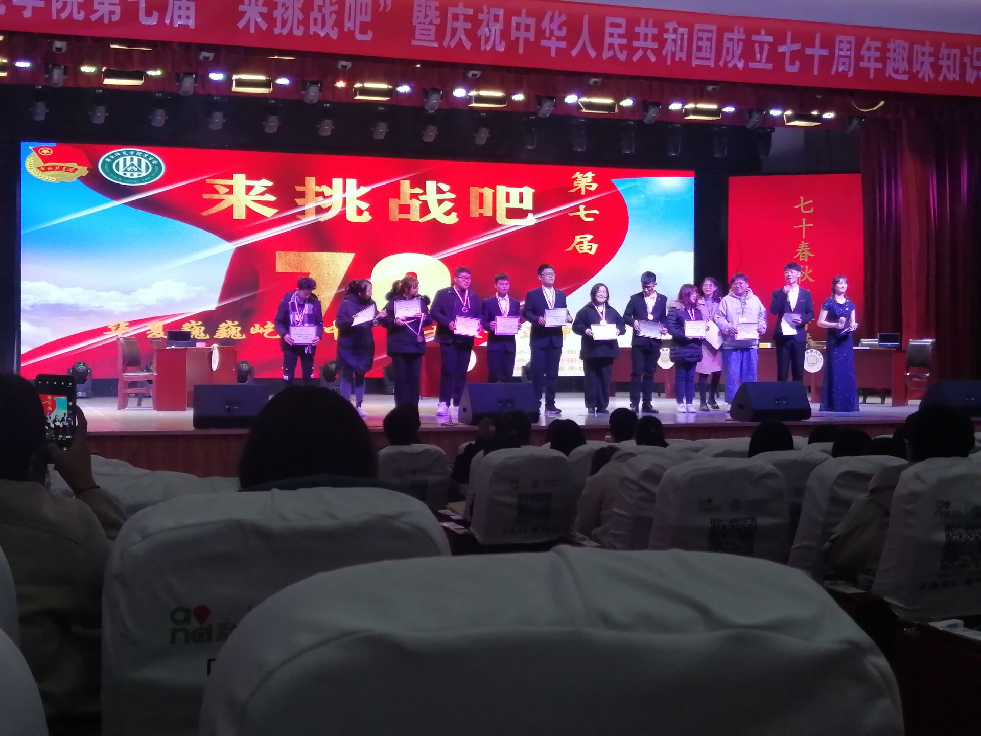 为庆祝中华人民共和国成立70周年,深入学习贯彻习近平新时代中国特色社会主义思想。12月7日下午,永利23411集团于睢阳校区大礼堂举办第七届《来挑战吧》趣味知识竞赛决赛。永利23411集团校团委副书记时光出席,9支代表队伍参赛。