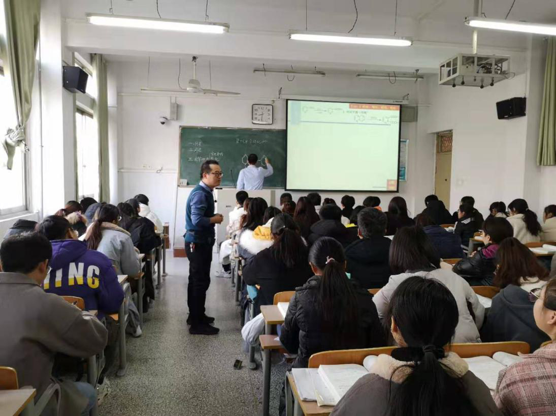 2019年12月11日周三上午第一节,化学化工学院刘新明老师的《有机化学》课程教学范式改革公开课在文化路校区1号教学楼411教室举行。授课班级为化学化工学院2018级材料科学、新能源专业18-1班,化学化工学院孟团结副院长、学院近三年新进教师参加了此次课堂教学观摩活动。此次公开课的内容是:第十七章杂环化合物。