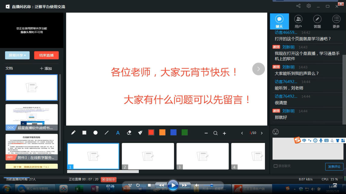 培训过程中,刘新明博士根据自己在泛雅平台建设《有机化学》课程的经验和体会,从三个方面介绍了泛雅平台的在线授课:一、如何利用超星客户端直播教学。二、如何利用超星泛雅平台建课。从章节结构、题库建设、教学管理、学生的导入等方面详细介绍了在泛雅平台上如何建课、上课。三、课程建成后对教学工作的良性影响。例如出试卷便捷高效,便于备课,利于教学过程监控,利于提升教学效果等。培训持续近两个小时,任课老师与刘新明老师积极互动交流,气氛活跃。老师们纷纷留言,表示刘老师讲解得简明扼要,干货满满,受益匪浅,通过这次培训原来一直担心的线上授课这个拦路虎也没那么难了,对保证在这个非常时期的教学进度、教学质量充满了信心。