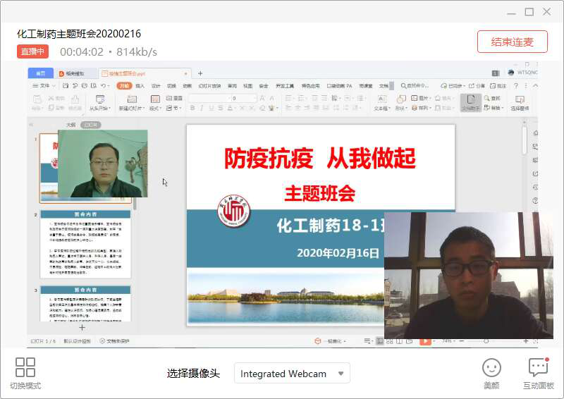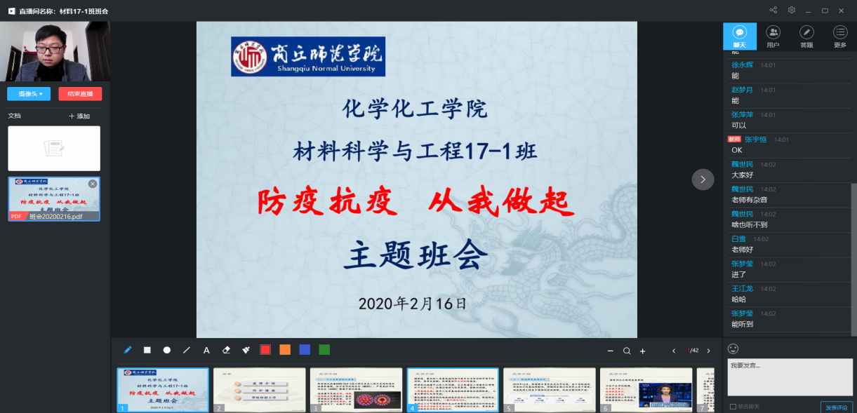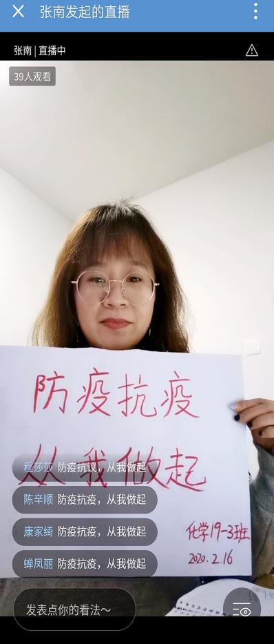 为增强同学们对新型冠状病毒的认识,提高警觉意识,约束自我行为,做好开学前的疫情防控准备工作。化学化工学院各级各班于2020年2月16日下午召开了“抗疫防疫,从我做起”线上主题班会。