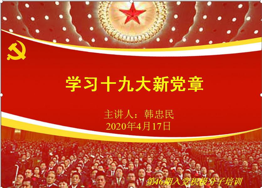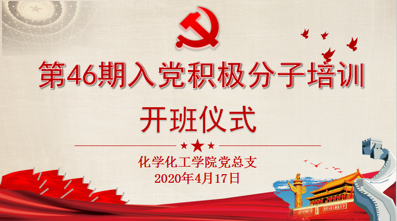 为加深入党积极分子对党的认识,端正入党动机,坚定入党决心,从思想和行为两个方面严格要求自己,从而激发入党积极分子向党组织靠拢的热情,自4月17至25日,化学化工学院党总支以线上集中培训、线下自学的方式对第46 期入党积极分子开展了培训活动。