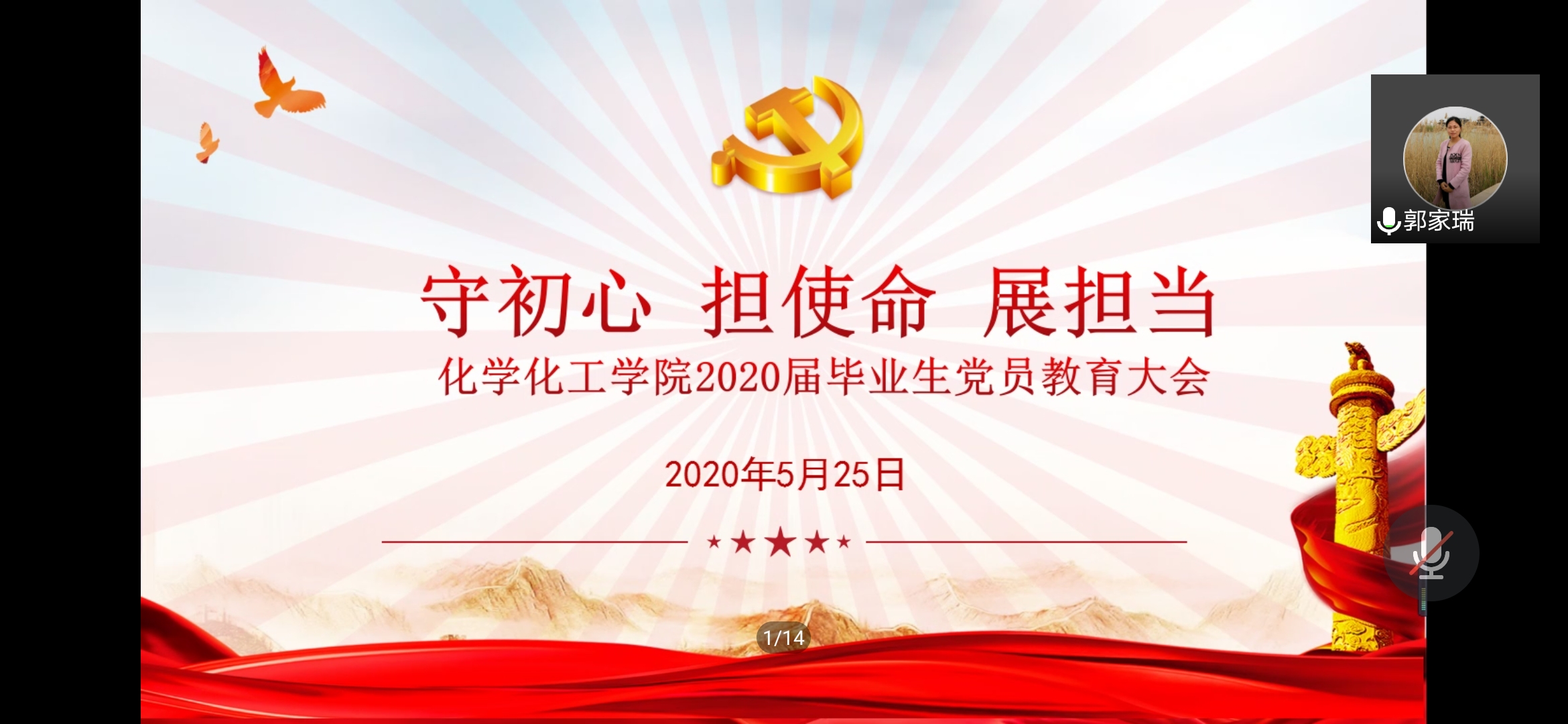 为了做好2020届毕业生党员离校前的有关工作,加强毕业生党员的教育,进一步提高毕业生党员党性意识和组织观念,增强党员意识,引导毕业生党员更好的发挥先锋模范作用,5月25日下午,化学化工学院在线召开“守初心、担使命、展担当”2020届毕业生党员教育大会。化学化工学院党总书记韩忠民、副书记刘瑛、学生第二党支部书记于丽敏及40多名毕业生党员参加了大会,学生第四党支部书记郭家瑞主持会议。