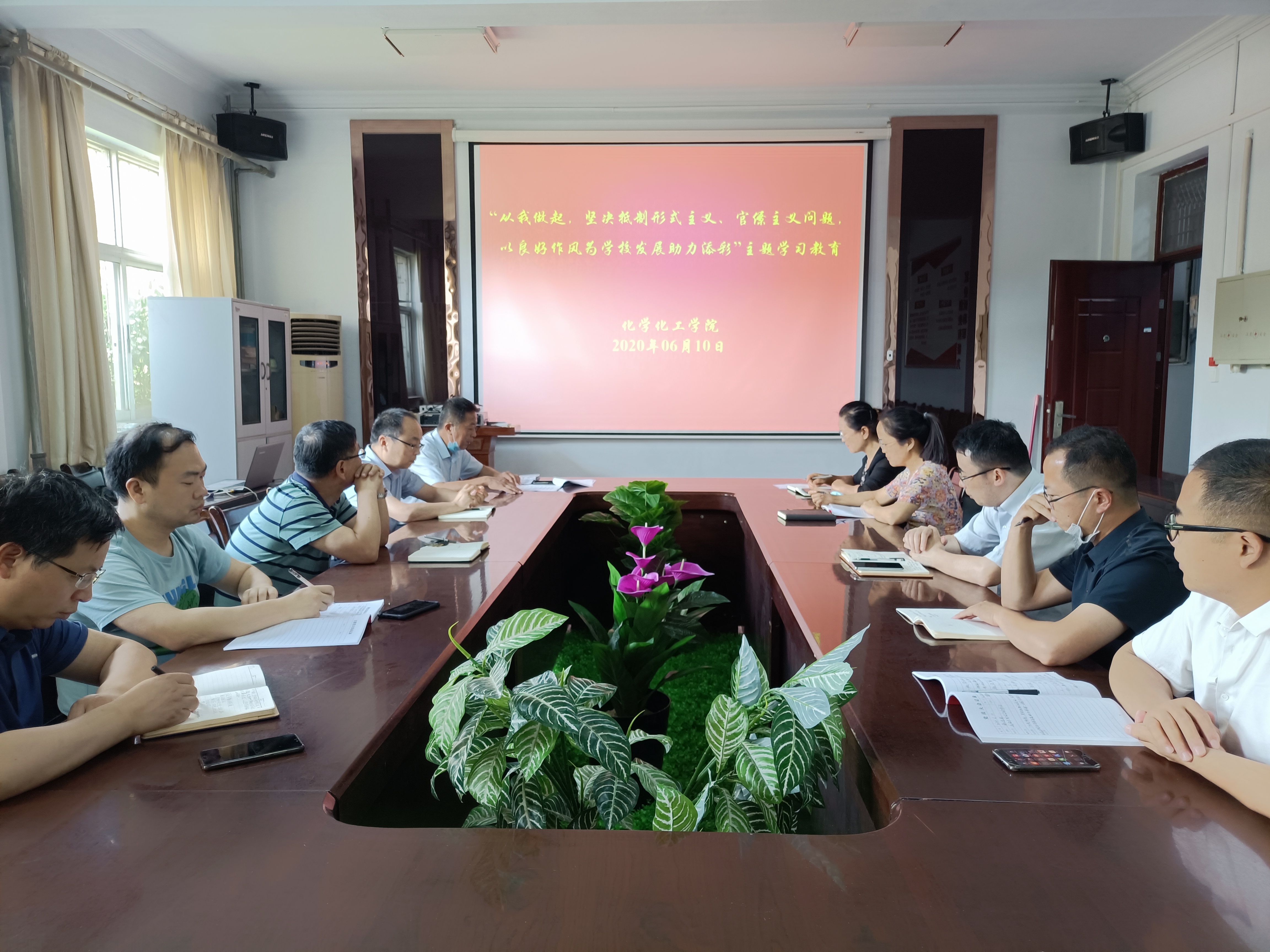 6月10日,化学化工学院党总支召开开展“从我做起,坚决抵制形式主义、官僚主义问题,以良好作风为学校发展助力添彩”主题学习教育,院党总支成员、处级领导干部和全体教师党支部书记参加会议。
