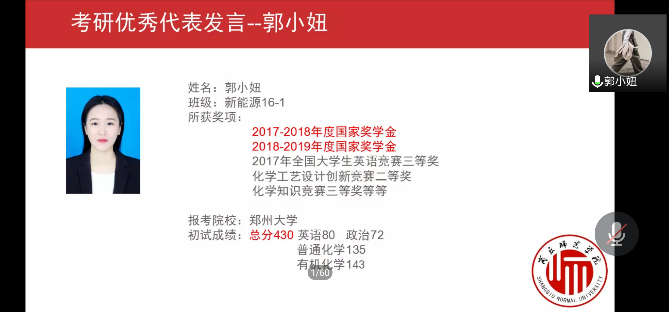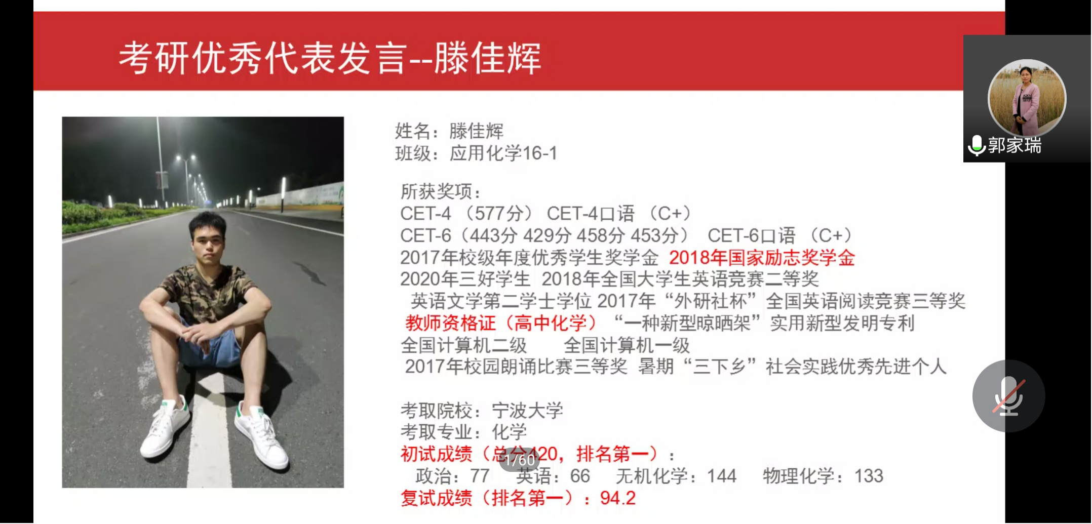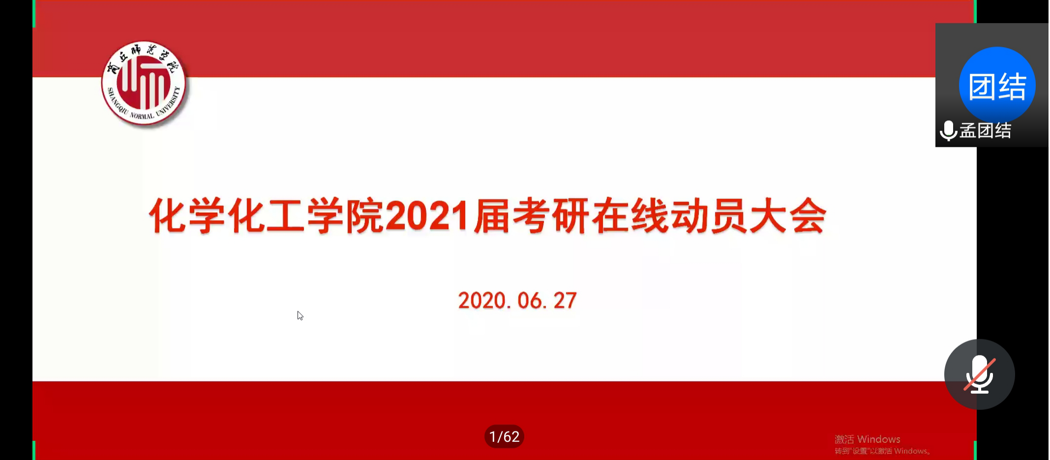 为使同学们对考研有更加深入的了解,帮助同学们正确树立奋斗目标,增强考研信心,提升考研竞争力,6月27日下午,化学化工学院在线举行了2021届考研动员大会。化学化工学院副院长孟团结、17级班主任、辅导员以及17级全体学生参加了本次动员大会。会议由17级辅导员郭家瑞主持。