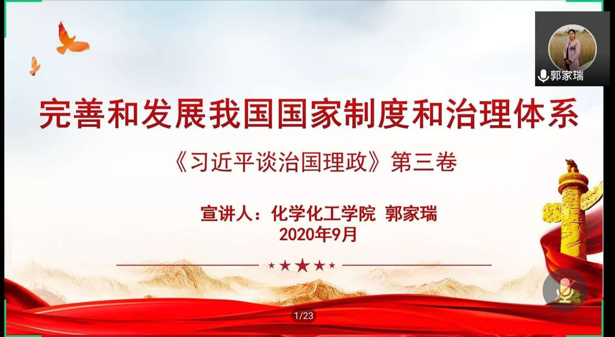 2020年9月19日,化学化工学院在学院会议室举行《习近平谈治国理政》第三卷理论宣讲进支部活动,本次宣讲活动通过线下、线上的方式开展,校团委副书记时光在线参加,宣讲人为化学化工学院辅导员郭家瑞。