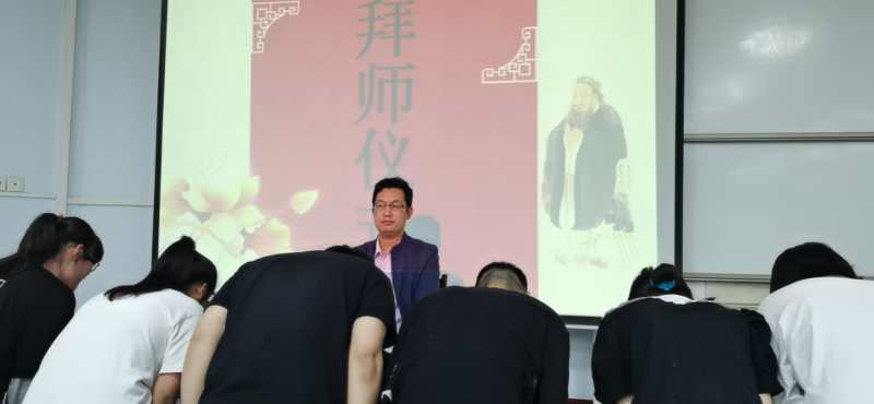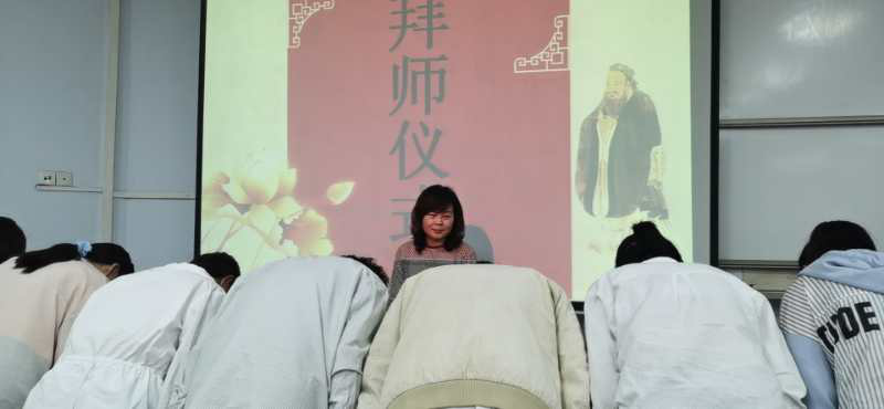 韦秀华老师首先宣读了10名优秀骨干教师与85名师范生师徒结对的名单。之后,举行了庄重的拜师仪式,工作坊全体学员分组向各位师傅三鞠躬行拜师礼。