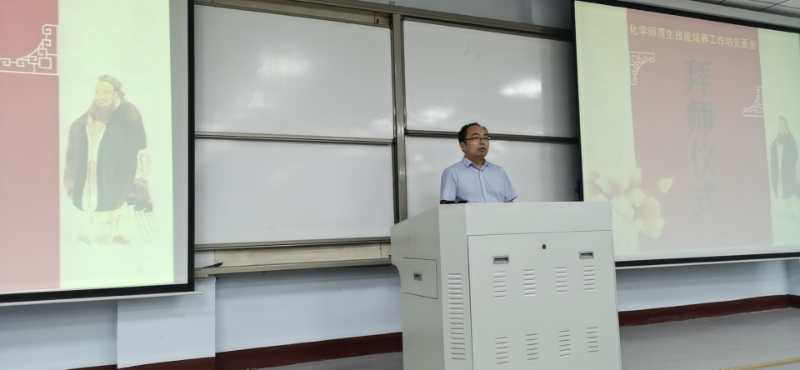 为进一步加快化学专业师范生专业成长步伐,着力打造一支师德高尚、业务精良的高素质教师队伍,9月25日下午,化学化工学院在我校睢阳校区1308教室举行化学专业“互联网+”师范生教学技能培养工作坊拜师仪式。化学化工学院党总支书记韩忠民,化学化工学院副院长孟团结,10位工作坊坊主,班主任张南老师及全体学员参加了仪式。会议由化学系主任韦秀华老师主持。