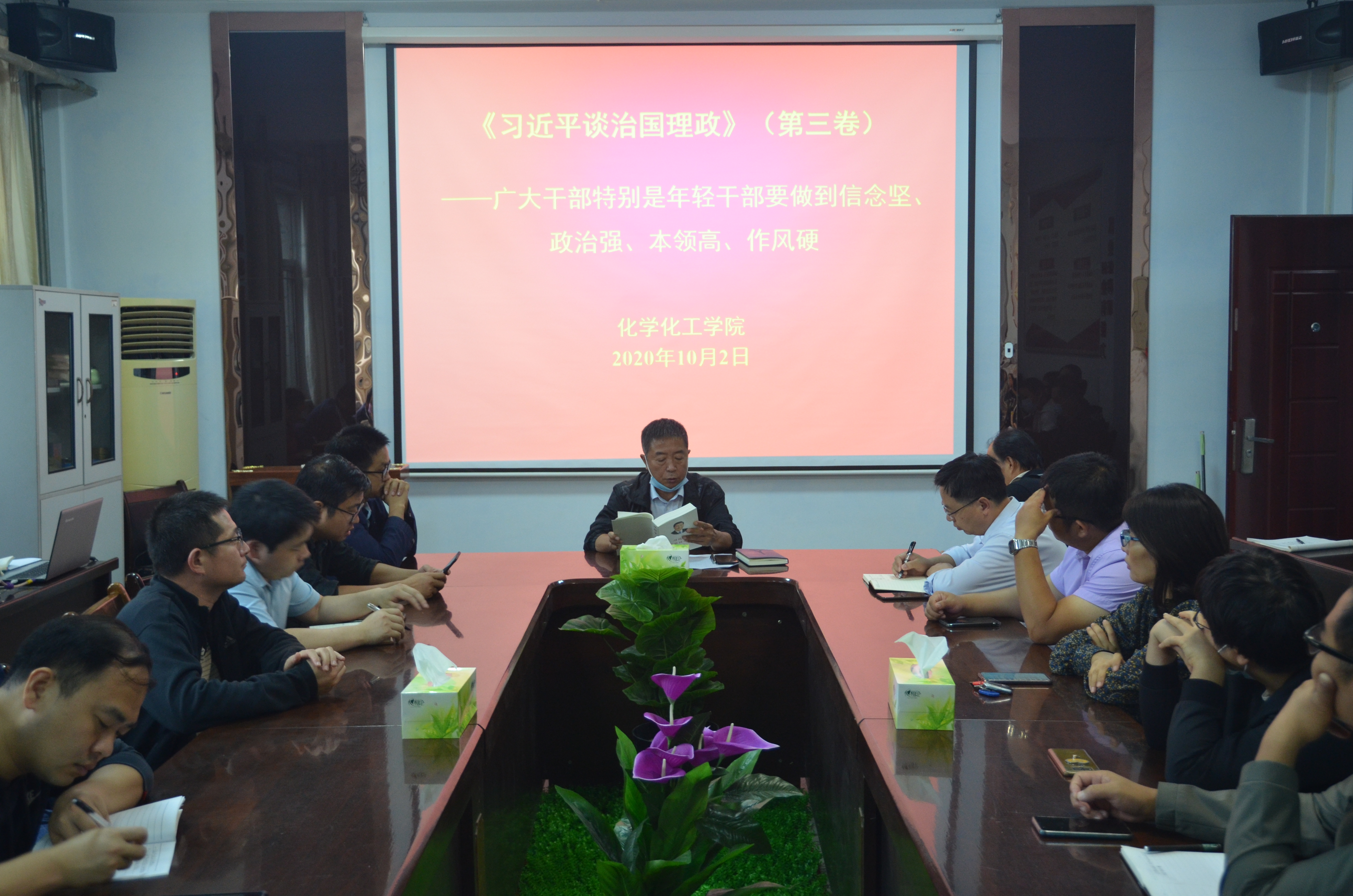 为深入学习习近平总书记重要讲话精神,全面贯彻落实“不忘初心、牢记使命”主题教育,推动主题教育常态化,践行宗旨意识,使守初心、担使命成为自觉行动,10月2日,化学化工学院组织广大师生学习《习近平谈治国理政》第三卷。