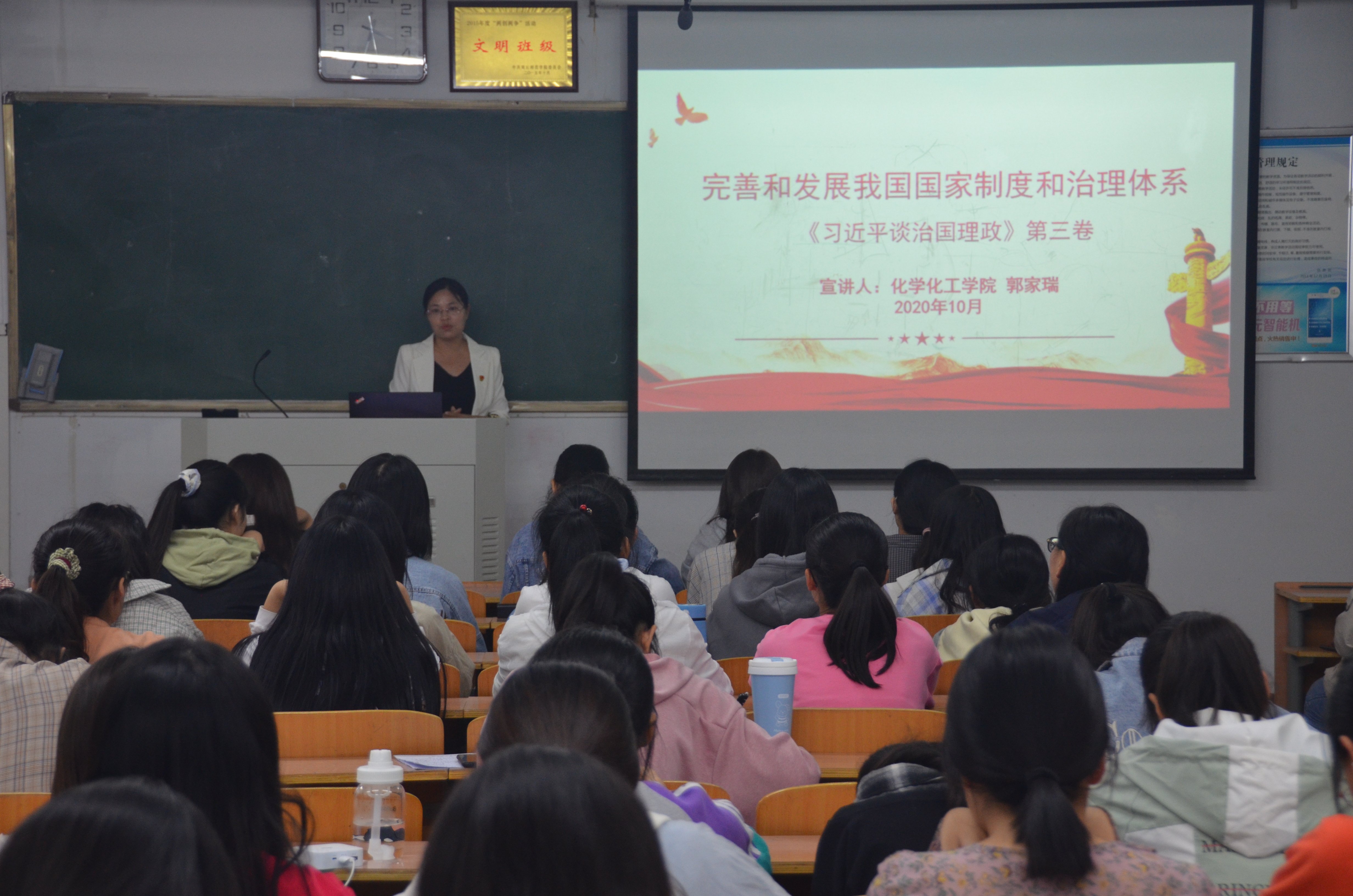 同日下午,《习近平谈治国理政》第三卷理论宣讲进支部活动第二场宣讲在1号楼408教室举行,化学化工学院17级辅导员郭家瑞作为宣讲人,带领同学们一起学习了第三个专题《完善和发展我国国家制度和治理体系》。郭家瑞首先从自身对研读完《完善和发展我国国家制度和治理体系》后的学习感悟,跟大家做了一个简单的分享,她认为这本著作,能够让大家更加深刻理解中国共产党为什么“能”,马克思主义为什么“行”,中国特色社会主义为什么“好”。