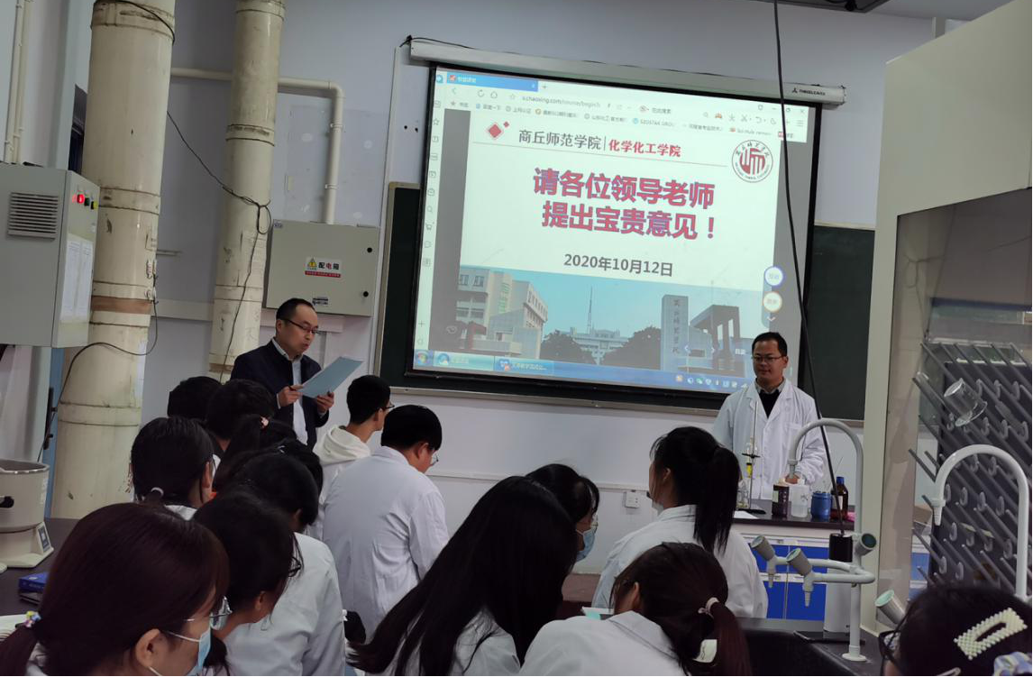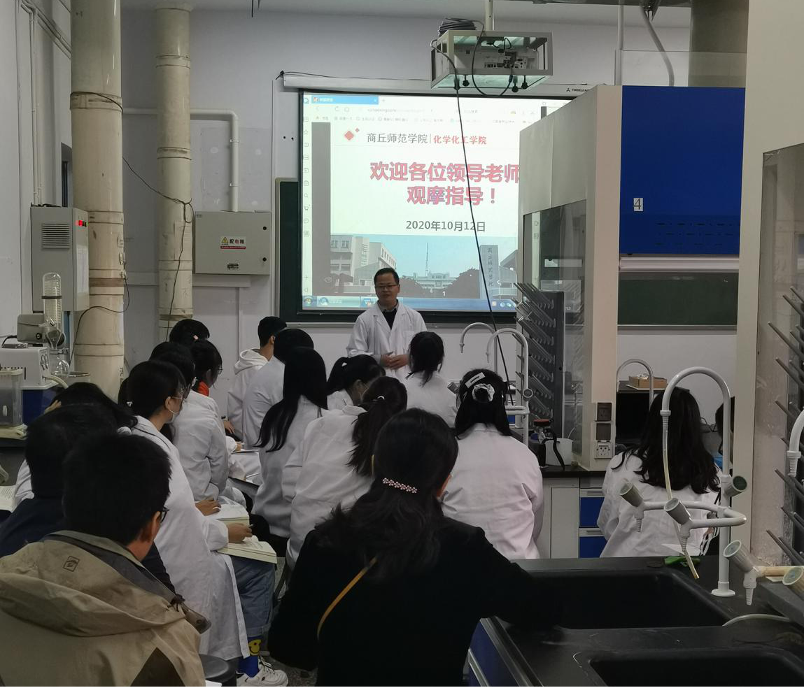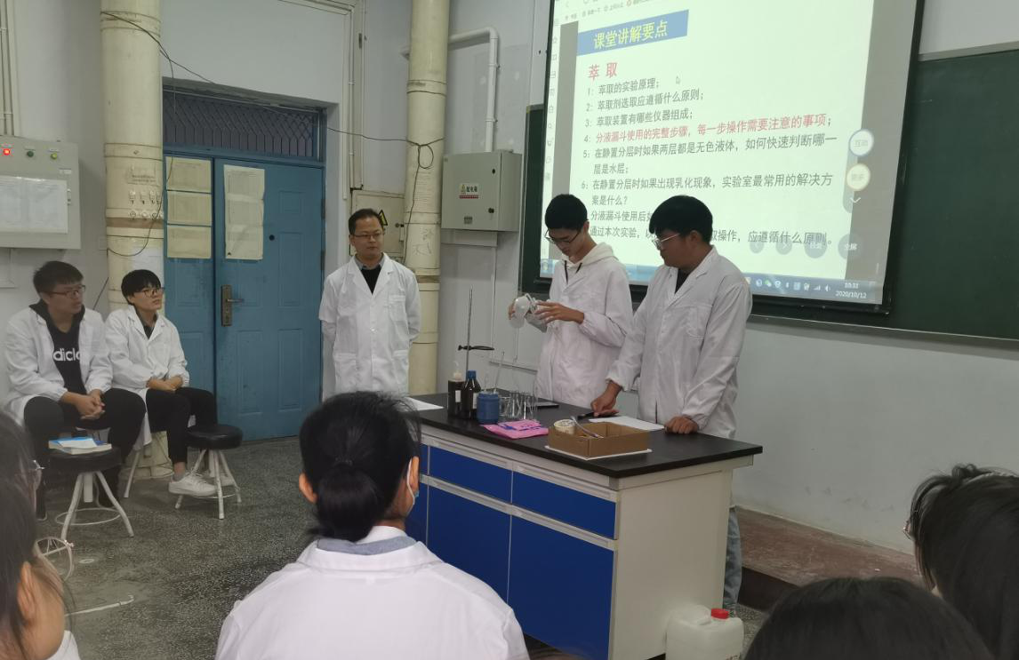 为扎实推进课堂教学范式改革工作,2020年10月12日周一上午第3节课,化学化工学院王涛老师负责的《有机化学实验》课程教学范式改革公开课在文化路校区化学实验楼407实验室举行。学院教学副院长孟团结教授,院督导团成员冯翠兰副教授,制药工程系部分教师和学院今年新入职青年教师参加了本次观摩活动。
