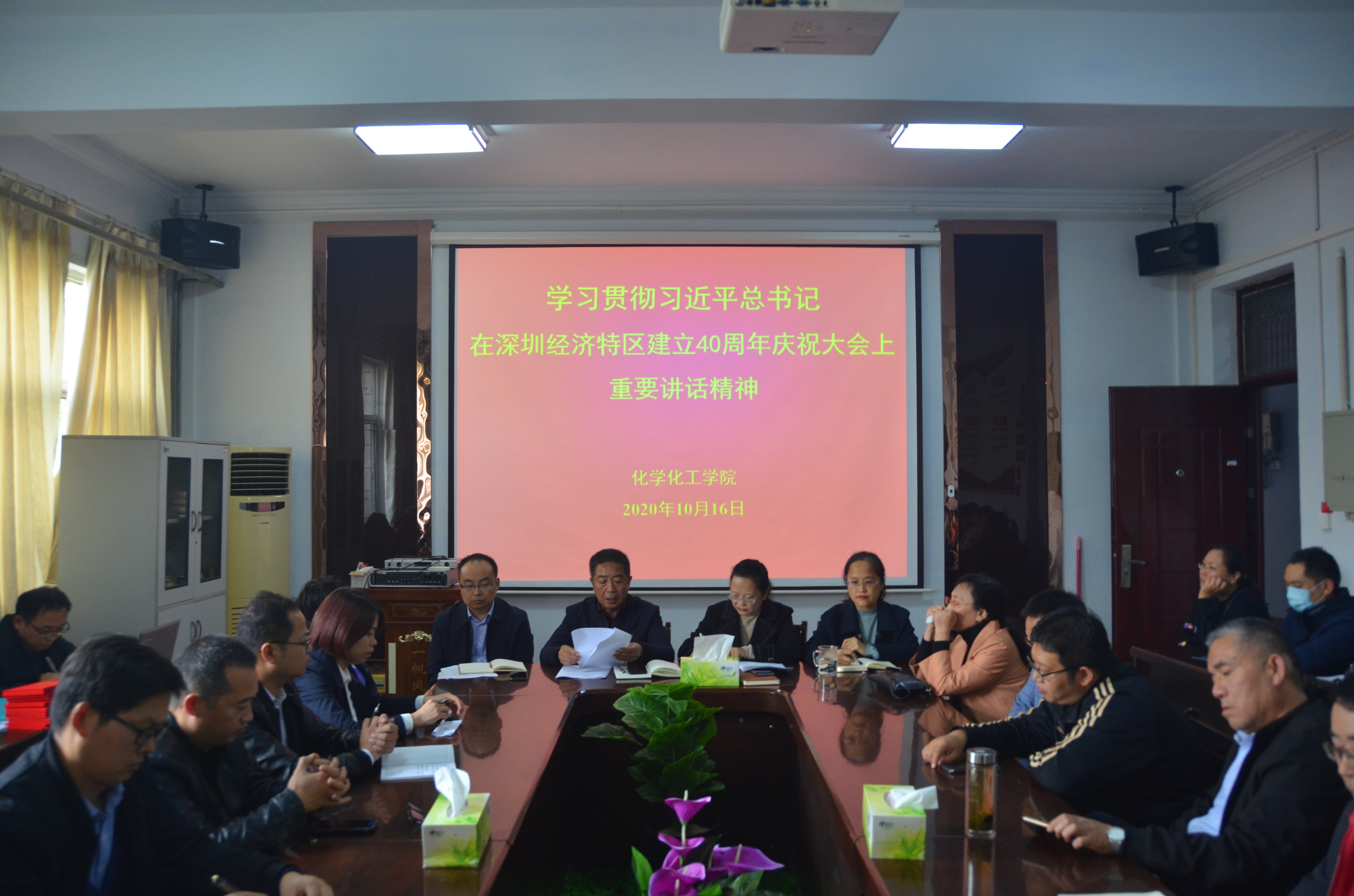 为明确教育工作新方向,走好教育长征路。2020年10月16日下午,化学化工学院于睢阳校区7号楼会议室组织学习“习近平总书记在深圳特区建立40周年庆祝大会上重要讲话精神”。化学化工学院党总支书记韩忠民主持,全体教职工参加。