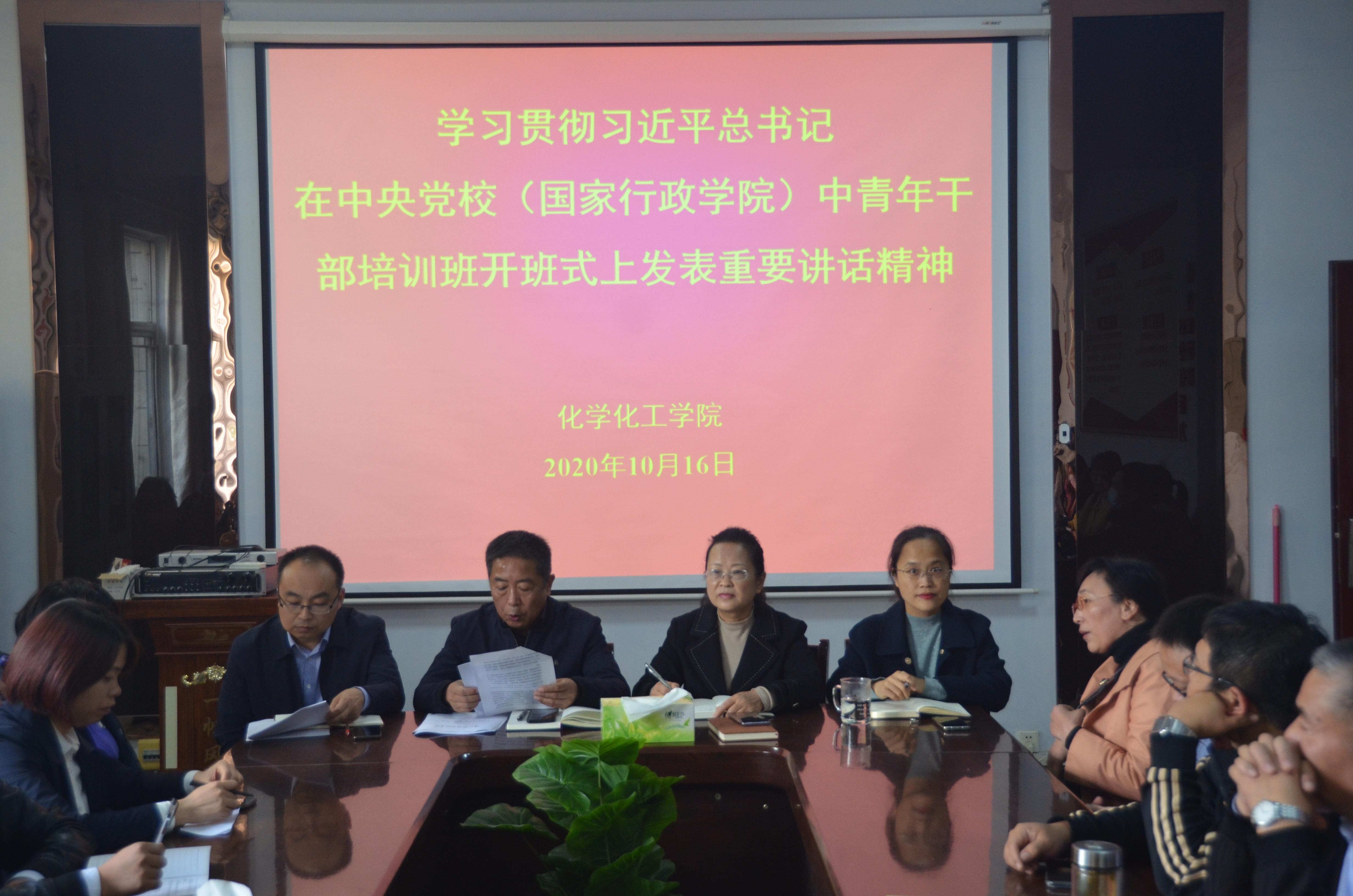 深入学习习近平新时代中国特色社会主义思想,提高永利23411集团中青年教师解决实际问题的能力,2020年10月16日下午,化学化工学院于睢阳校区7号楼会议室组织全体教职工学习“习近平在中央党校(国家行政学院)中青年干部培训班开班式上的重要讲话”精神。会议由党总支书记韩忠民主持。