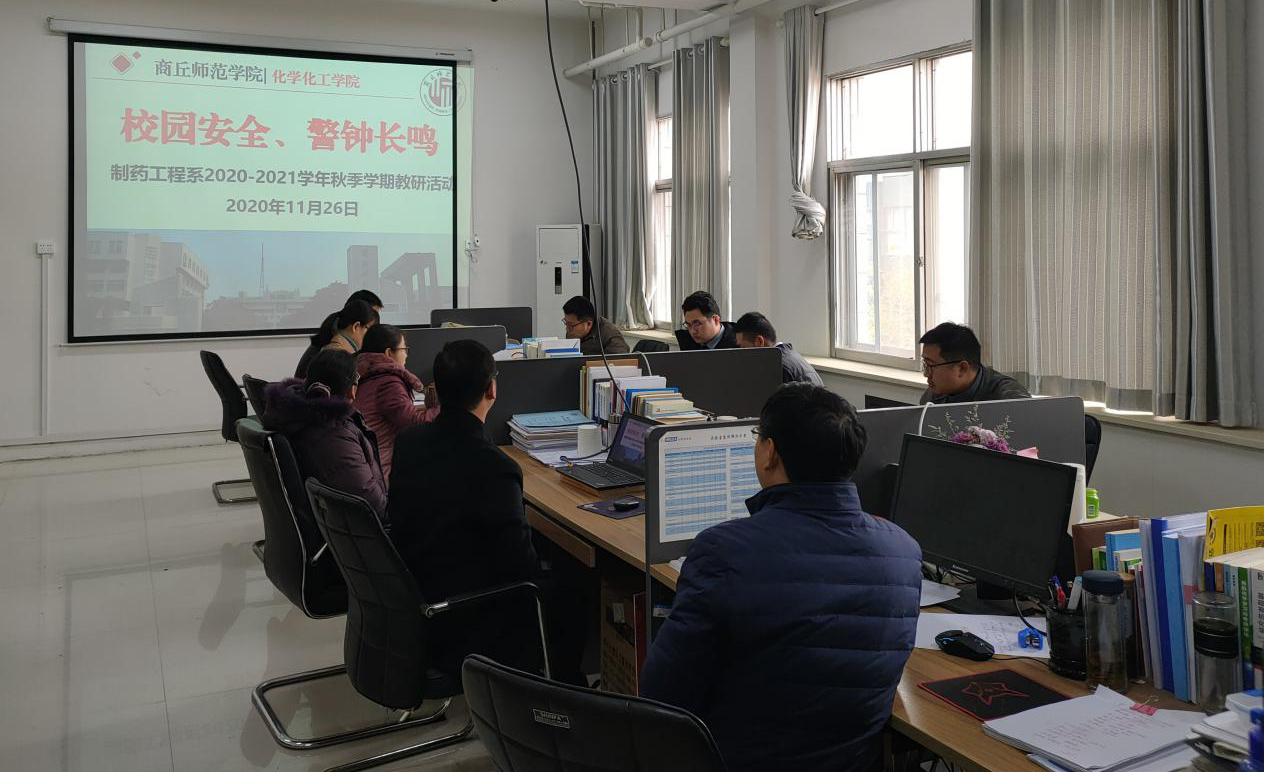 为加强学校学院的安全管理工作,预防安全责任事故的发生,确保各项工作的正常进行,2020年11月26日化学化工学院制药工程系在睢阳校区化学实验楼416室召开了以“校园安全、警钟长鸣”为主题的教研活动,活动由制药工程系主任王涛老师主持。