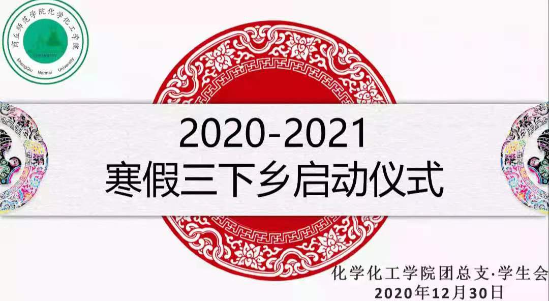 为引导青年学子扎根中国大地,了解国情民情,并通过社会实践,坚定理想信念,站稳人民立场,练就过硬本领,投身强国伟业,2020年12月30日晚,化学化工学院在线上举行了“2020-2021学年寒假三下乡活动启动仪式”。化学化工学院学生会主席团成员出席,三下乡团队成员参加。