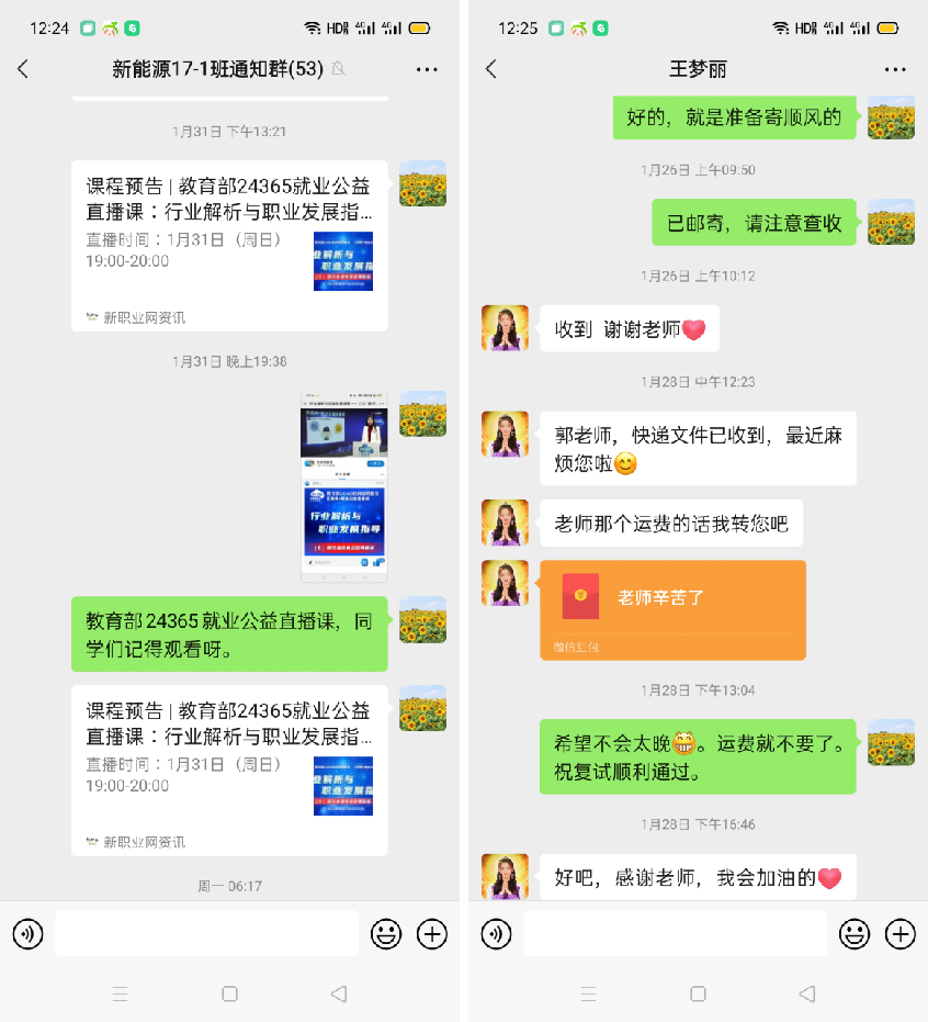 虽然目前正处于寒假假期,但2021届毕业班辅导员和班主任们的服务无假期。寒假期间也是毕业生报考公务员、实习、求职的黄金时期,毕业班辅导员和班主任们及时推送就业信息、为毕业生寄送材料,给毕业生提供便利。