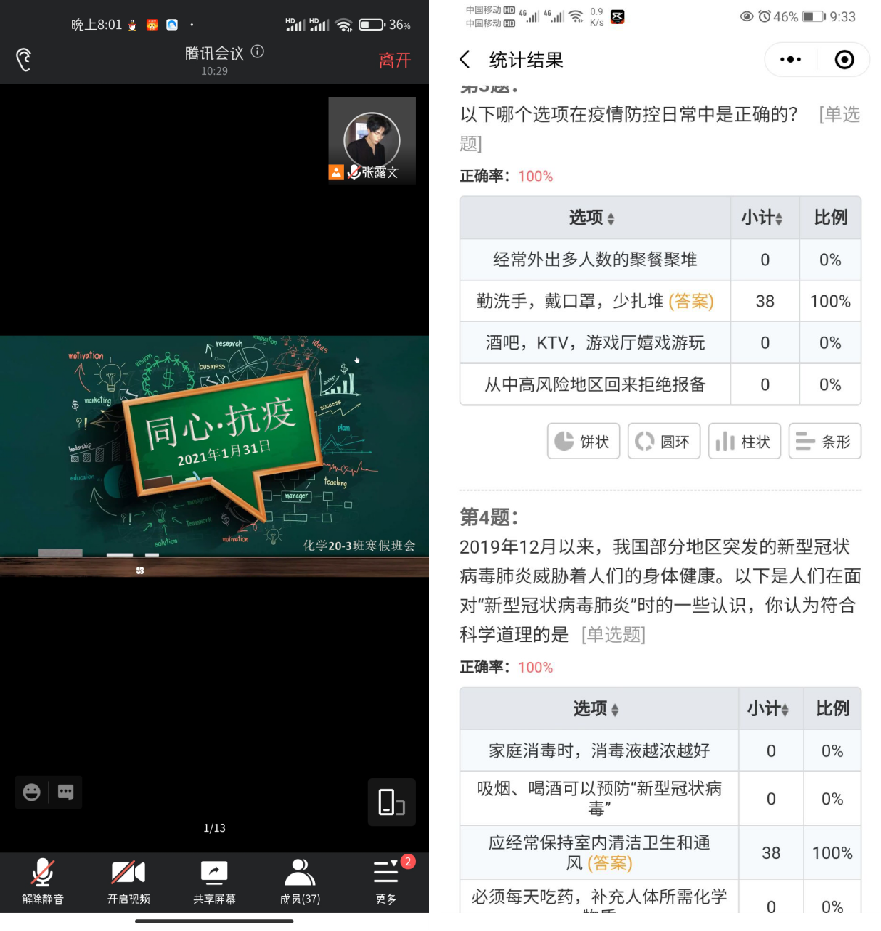 1月31日,化学20-3班通过腾讯会议开展了“同心·抗疫”主题班会。辅导员李龙梅老师和班主任韩华博参加活动。本次线上班会由班长张露文同学主持。