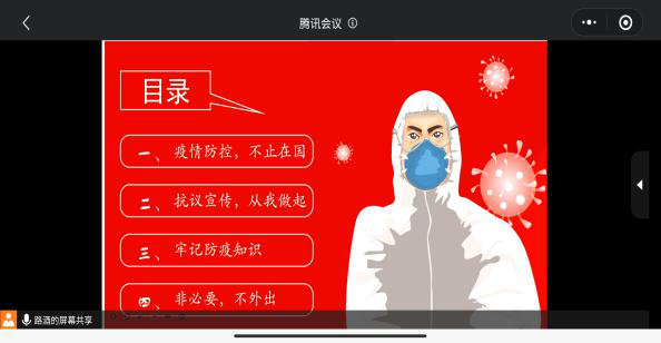 之后他着重向同学们普及了疫情防控知识,号召同学们“非必要不外出,原地过年,严防疫情”,他希望同学们做到以下四点:一、在家做好正确的防控,调整好心态,准备好常用物资,如体温计、一次性口罩、消毒用品等;二、多通风,适当消毒,保持家居环境干净整洁,保持物品清洁卫生;三、尽量避免到人群密集、不良通风的地方,必要出门时正确佩戴口罩,回家立马用洗手液或肥皂洗手,并用消毒液对衣服消毒;四、在家可以做一些室内运动来增强体质,多喝水、多休息、避免熬夜、合理饮食,保持身心健康。