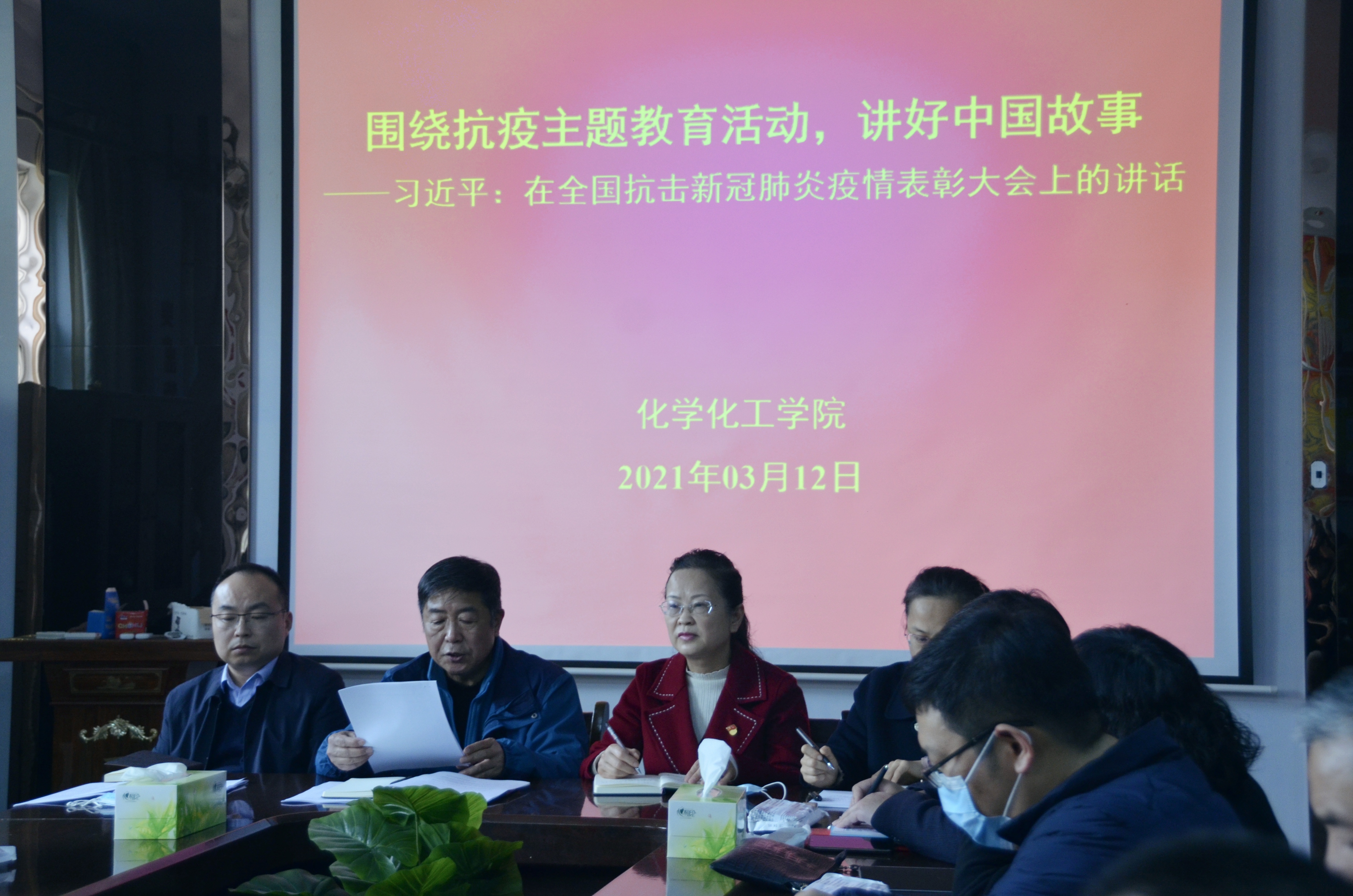 3月12日,化学化工学院于睢阳校区7号楼会议室举行了“开展抗疫教育活动,讲好中国故事”专题学习会议--学习贯彻习近平总书记在全国抗击新冠肺炎疫情表彰大会上的讲话精神 。会议由化学化工学院党总支书记韩忠民主讲,全体教职工参加。